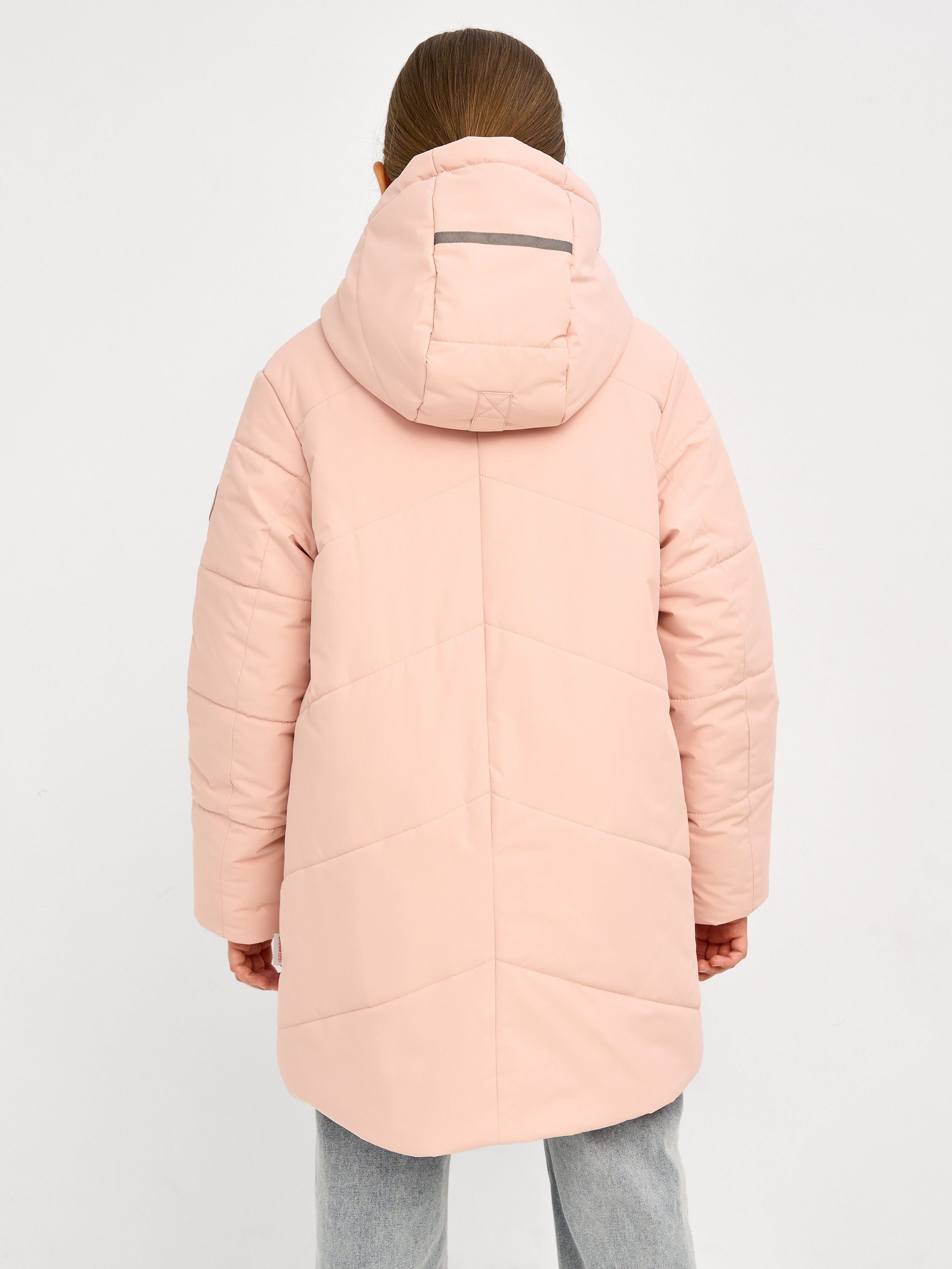 Зимняя удлиненная куртка для девочки. Прямого силуэта, чуть расклешенная к низу, с втачным капюшоном. Центральная застёжка на молнию, закрытую центральной планкой на кнопках и липучках. Подкладка из искусственного шёлка и флиса с внутренним карманом, с утяжкой по талии. 2 нижних накладных кармана с клапанами на кнопках. Внутренний манжет рукава из трикотажа. Рассчитана на температуру от -10 до -25.