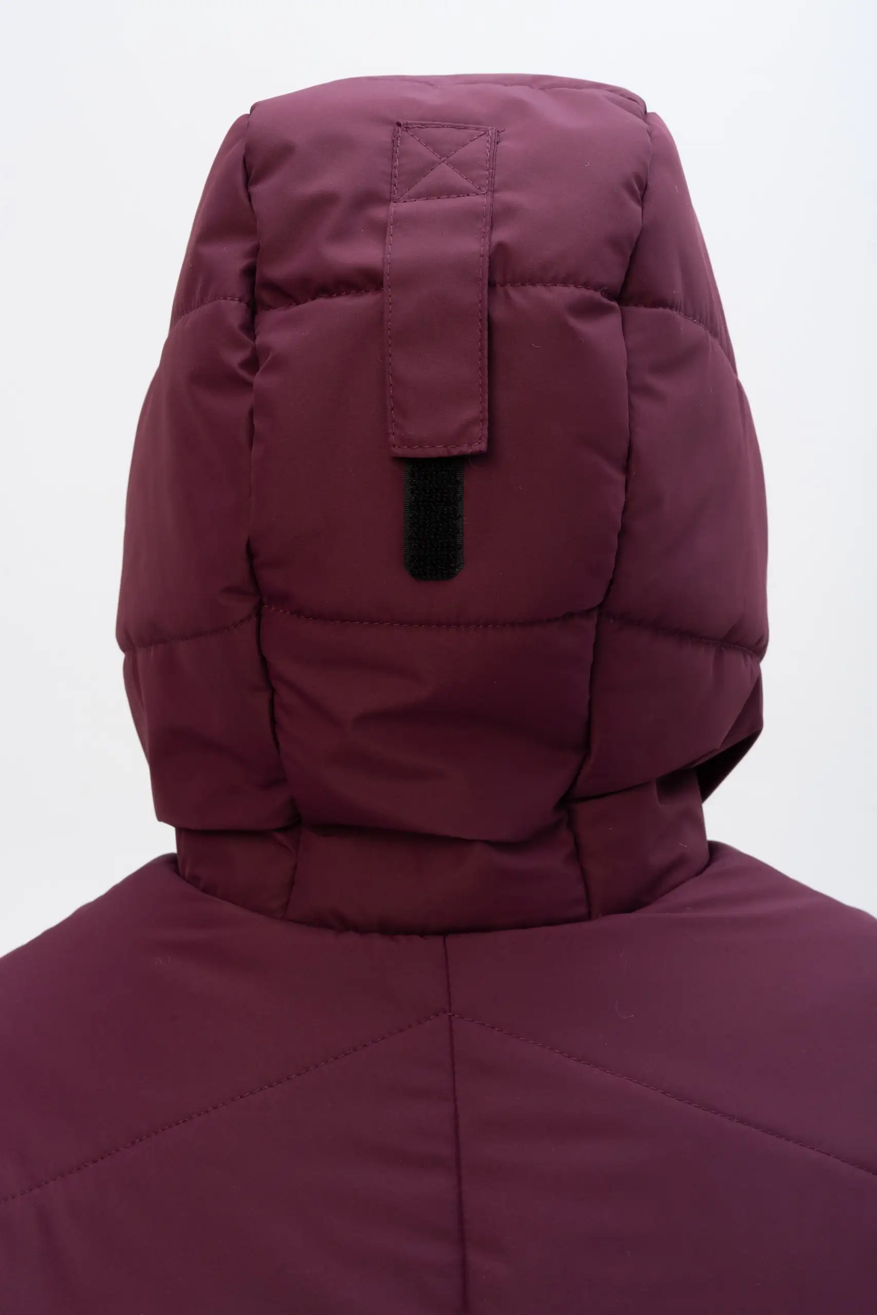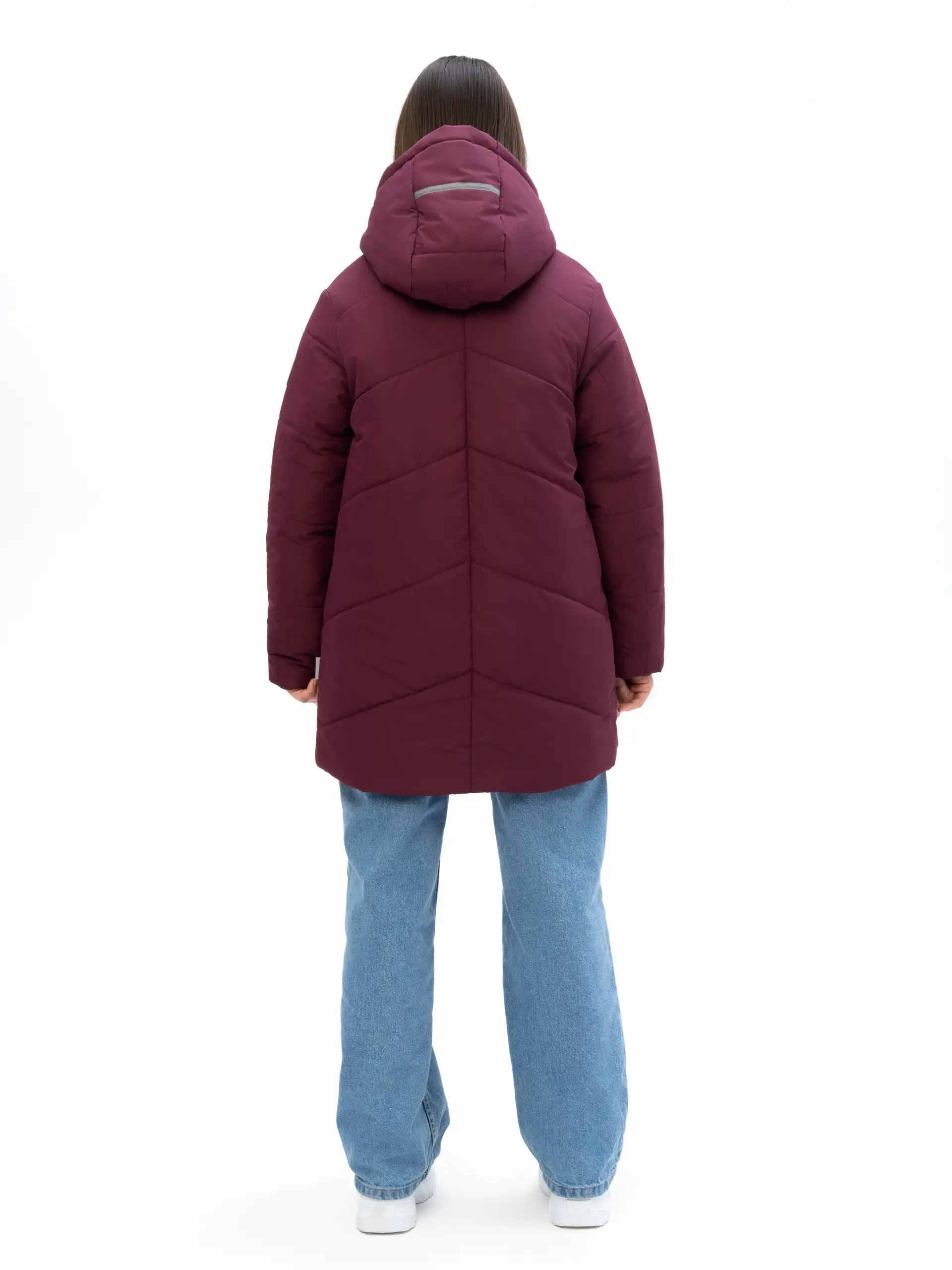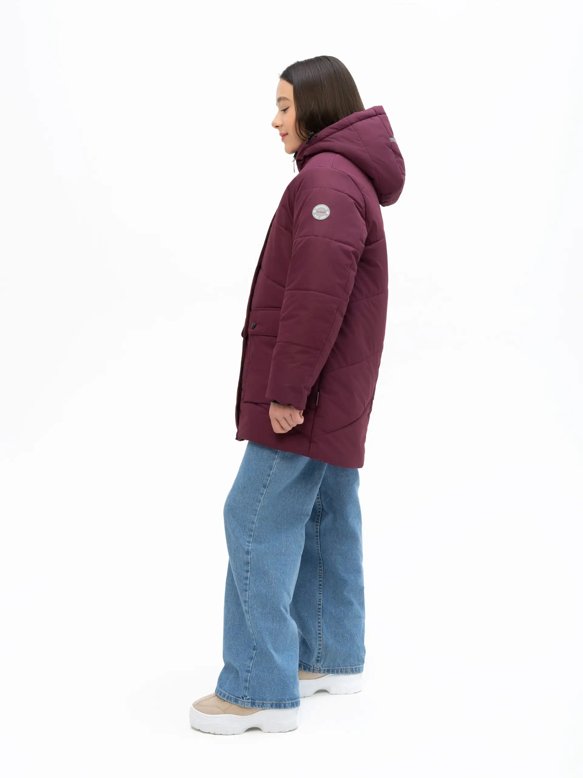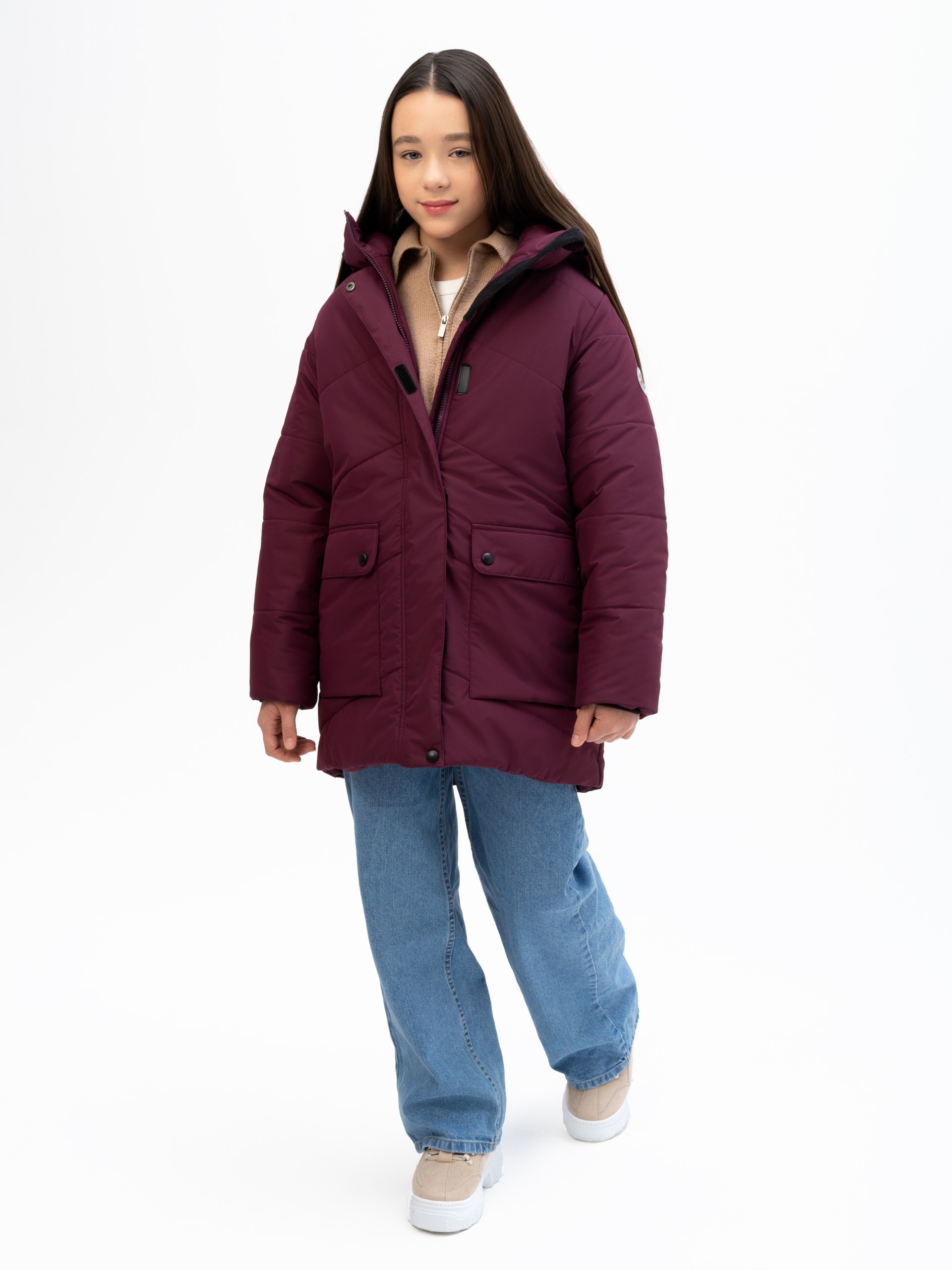 Зимняя удлиненная куртка для девочки. Прямого силуэта, чуть расклешенная к низу, с втачным капюшоном. Центральная застёжка на молнию, закрытую центральной планкой на кнопках и липучках. Подкладка из искусственного шёлка и флиса с внутренним карманом, с утяжкой по талии. 2 нижних накладных кармана с клапанами на кнопках. Внутренний манжет рукава из трикотажа. Рассчитана на температуру от -10 до -25.