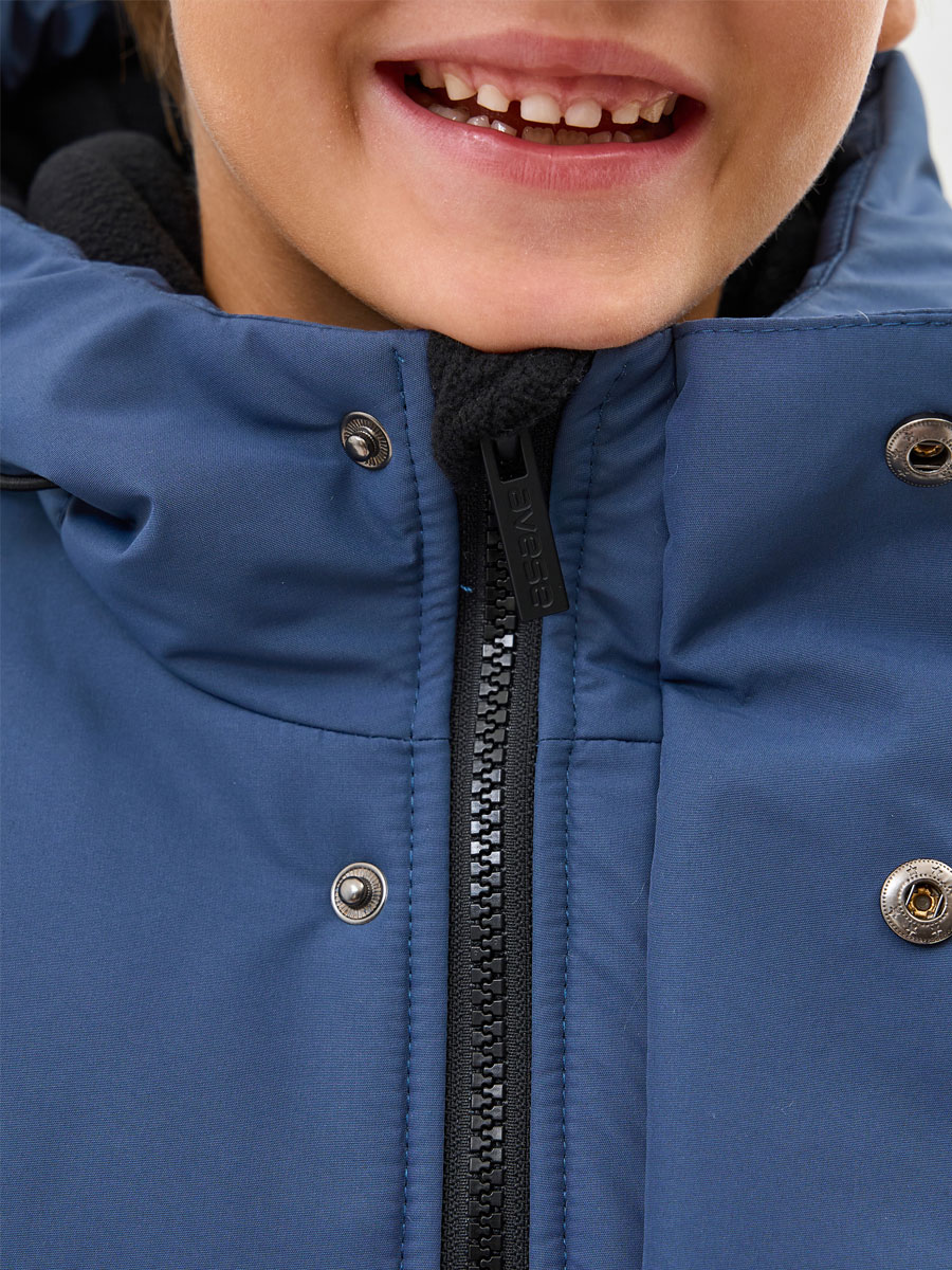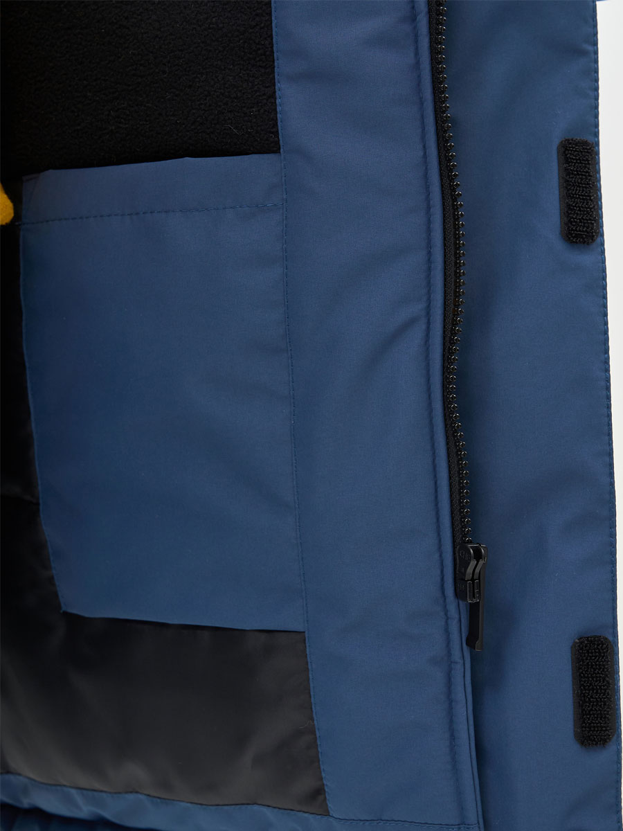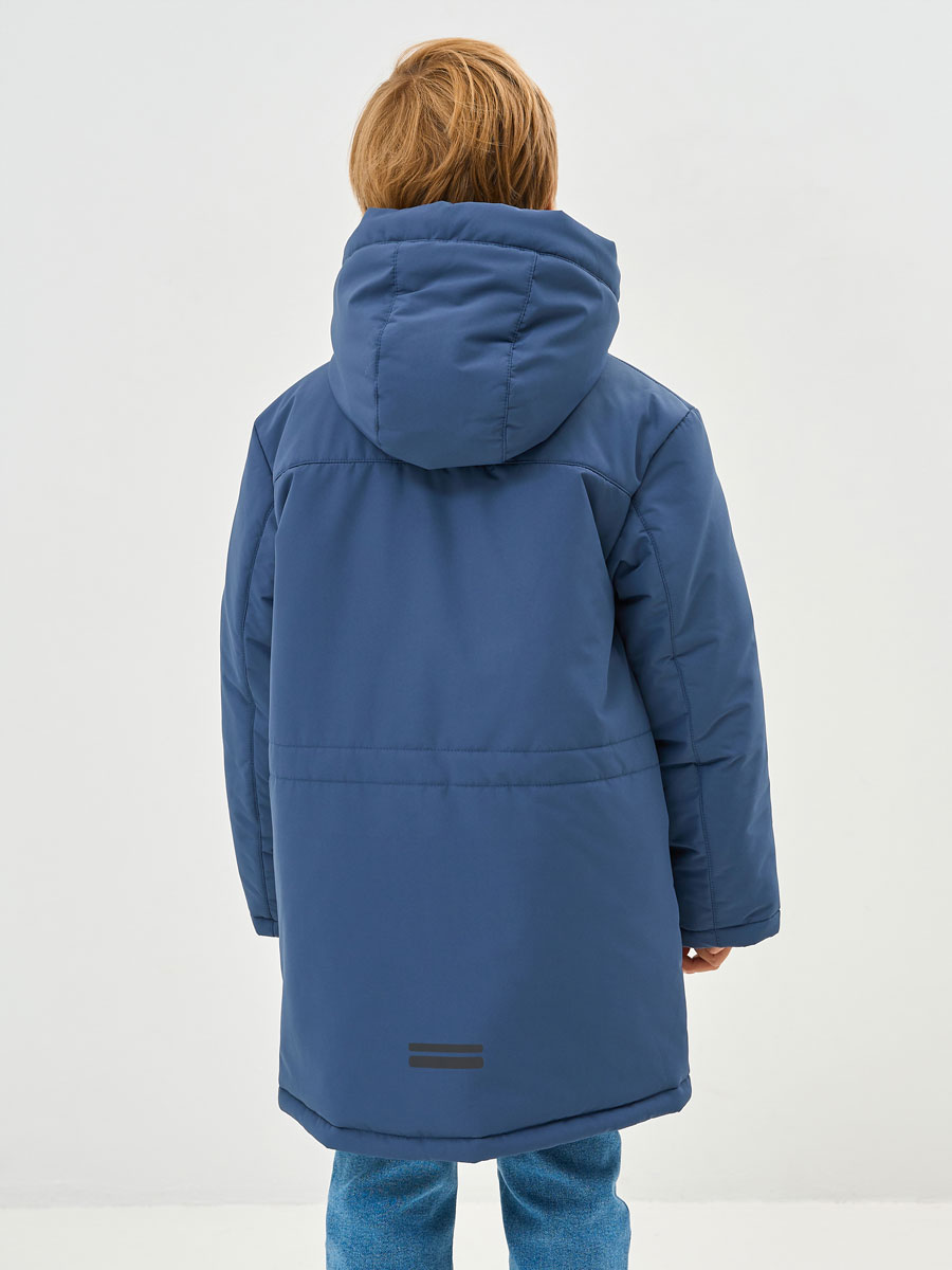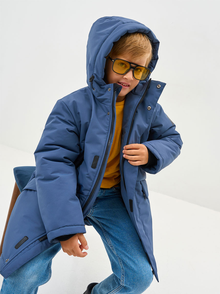 Зимняя удлиненная куртка для мальчика. Прямого силуэта, с втачным капюшоном. Центральная застёжка на молнию, закрытую планкой на кнопках и липучках. Верхние карманы прорезные, с открытыми молниями. Нижние караманы в швах с клапаном на кнопке. Низ рукава прямой с внутренним манжетом из трикотажа. Капюшон втачной. По лицевому краю капюшона кулиса с люверсами и резиновым шнуром с фиксаторами для регулировки. Внутренний капюшон из флиса.Подкладка с флисом, с внутренним карманом. На куртке располагаются светоотражающие элементы. Куртка рассчитана на температуру от -10 до -25.
