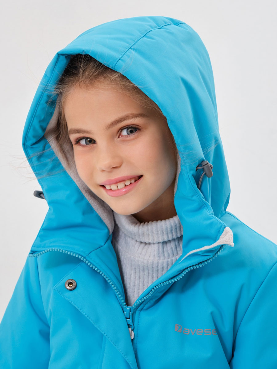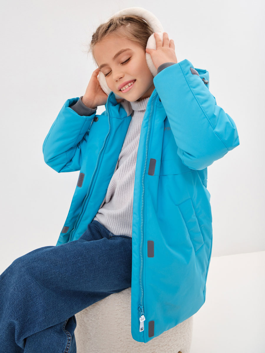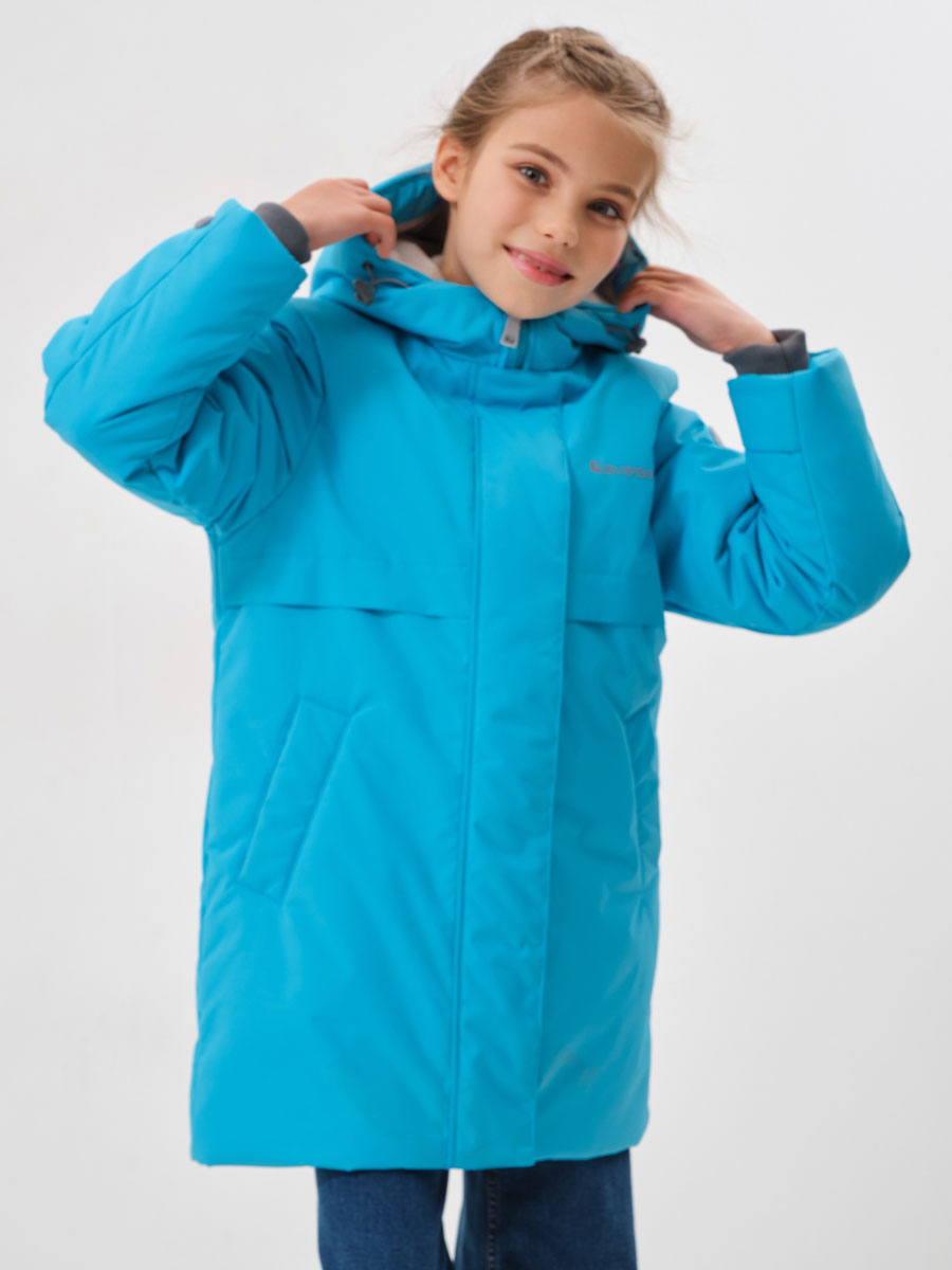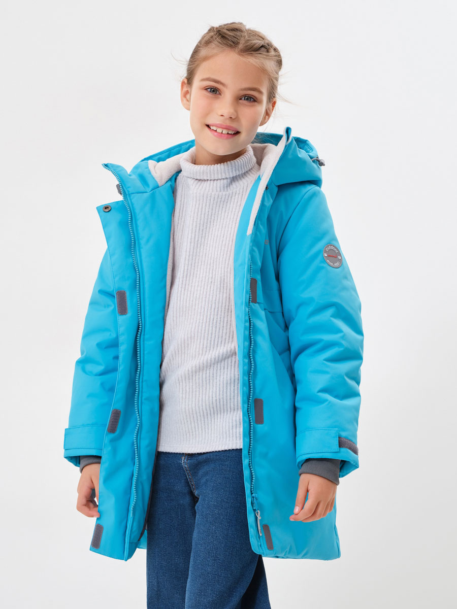 Зимняя удлиненная куртка для девочки. Прямого силуэта, чуть расклешенная книзу, с втачным капюшоном Центральная застёжка на молнию, закрытую центральной планкой на потайной кнопке и липучках. В бегунке центральной молнии светоотражающая подвеска. По талии в подкладке - кулиса с резиновым шнуром, для дополнительного прилегания. На полочках карманы с листочками на магнитных кнопках. По низу рукава паты на липучках. Внутренний манжет из трикотажа. Подкладка и внутренний капюшон с флисом. На подкладке – накладной карман с липучкой. На куртке располагаются светоотражающие элементы. Куртка рассчитана на температурный режим от -10 до -25.