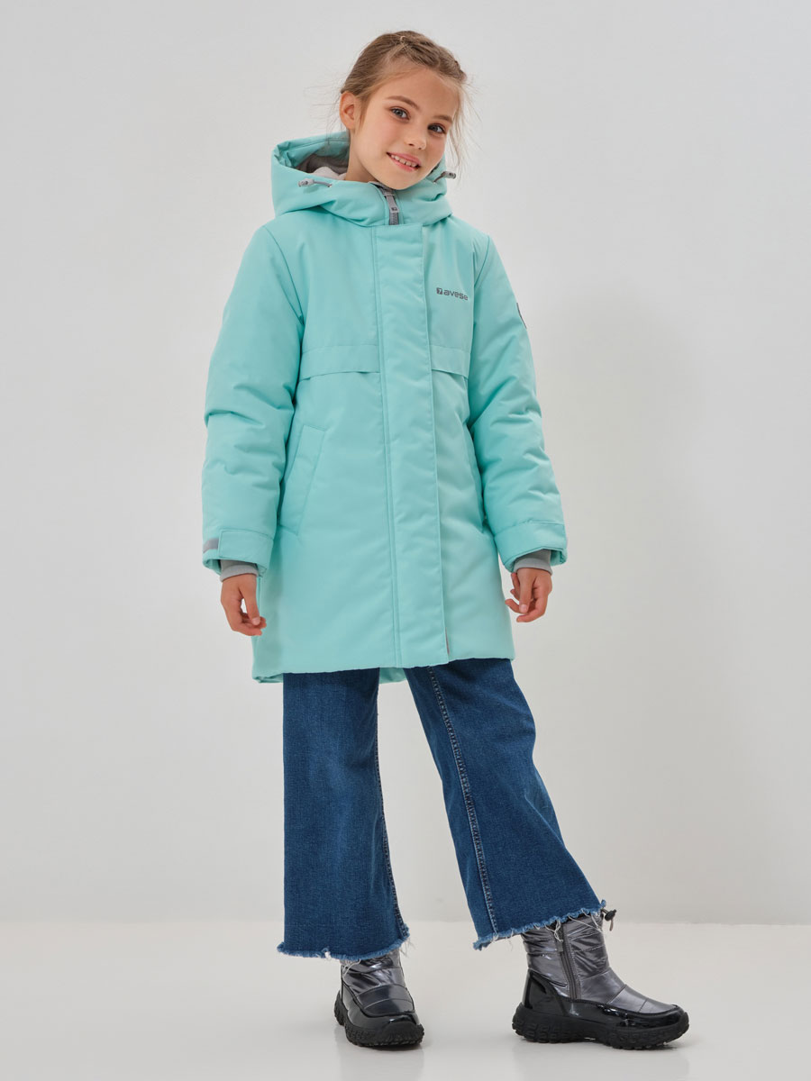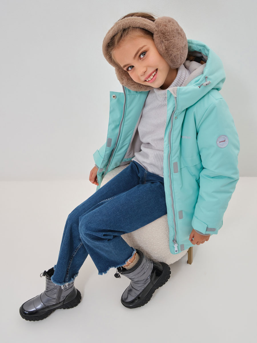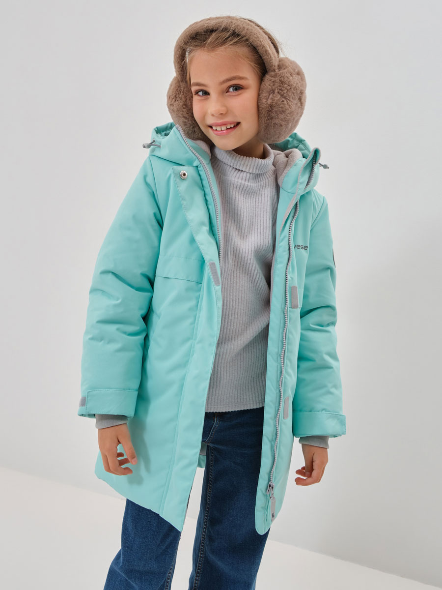 Зимняя удлиненная куртка для девочки. Прямого силуэта, чуть расклешенная книзу, с втачным капюшоном Центральная застёжка на молнию, закрытую центральной планкой на потайной кнопке и липучках. В бегунке центральной молнии светоотражающая подвеска. По талии в подкладке - кулиса с резиновым шнуром, для дополнительного прилегания. На полочках карманы с листочками на магнитных кнопках. По низу рукава паты на липучках. Внутренний манжет из трикотажа. Подкладка и внутренний капюшон с флисом. На подкладке – накладной карман с липучкой. На куртке располагаются светоотражающие элементы. Куртка рассчитана на температурный режим от -10 до -25.