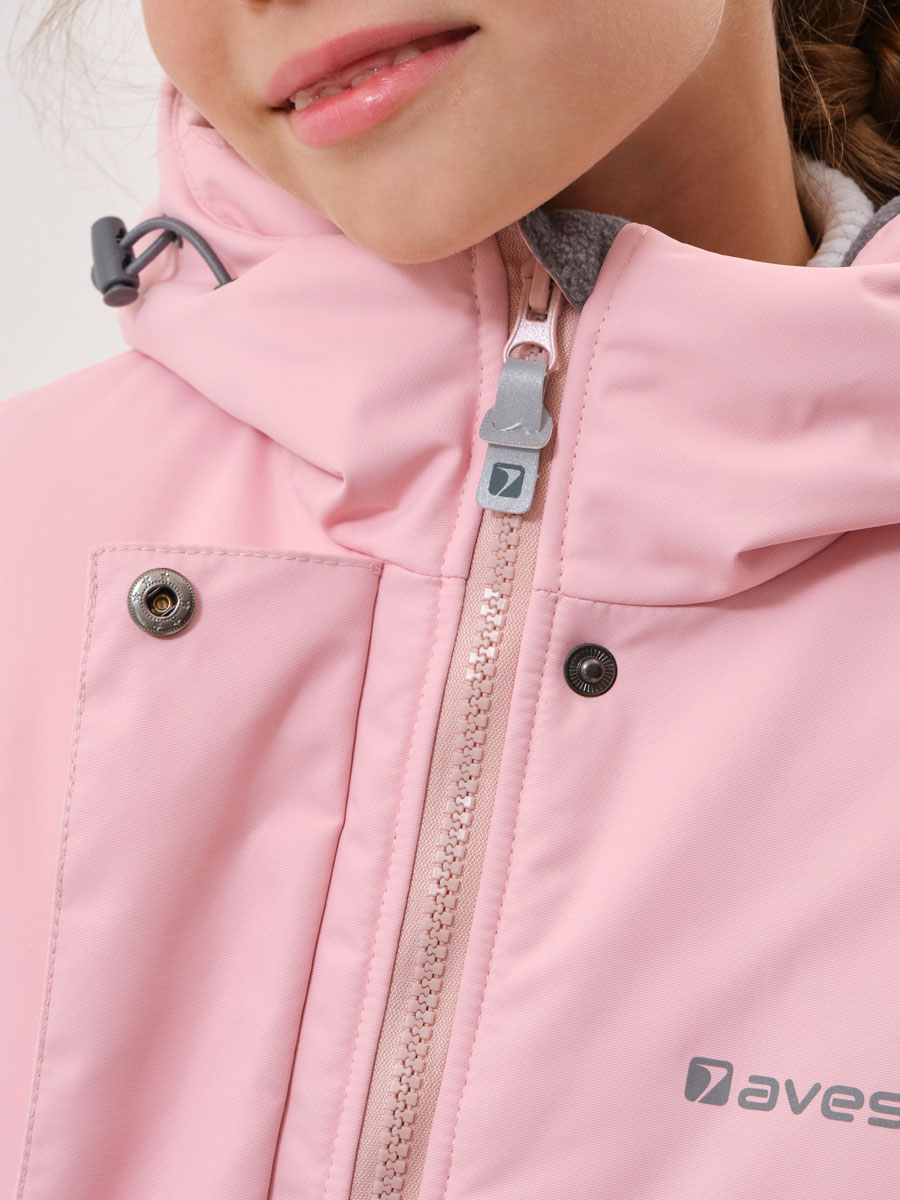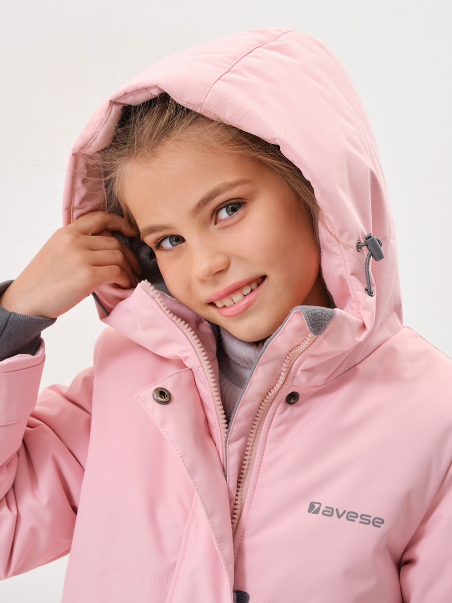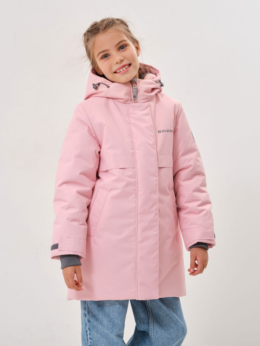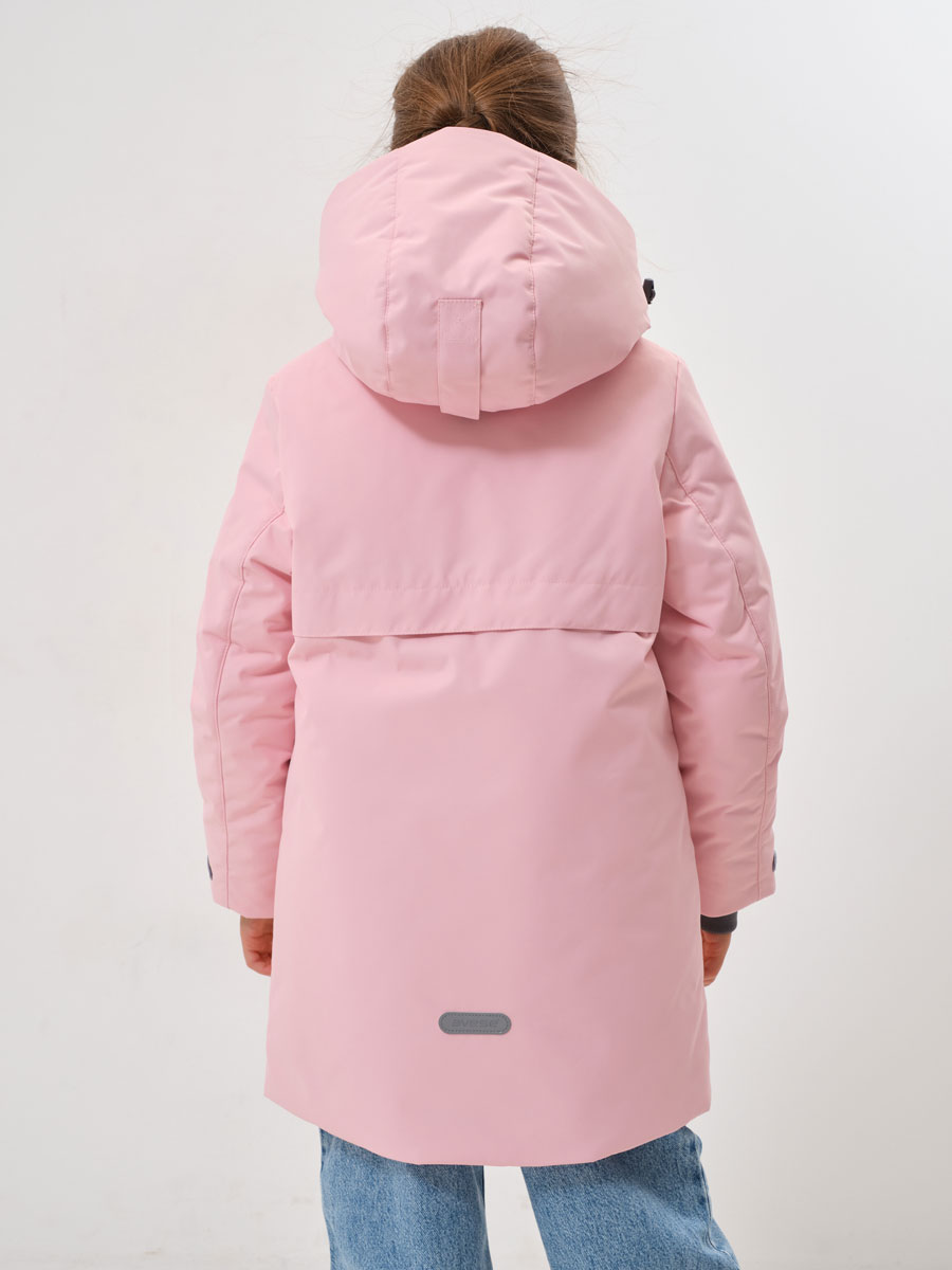 Зимняя удлиненная куртка для девочки. Прямого силуэта, чуть расклешенная книзу, с втачным капюшоном Центральная застёжка на молнию, закрытую центральной планкой на потайной кнопке и липучках. В бегунке центральной молнии светоотражающая подвеска. По талии в подкладке - кулиса с резиновым шнуром, для дополнительного прилегания. На полочках карманы с листочками на магнитных кнопках. По низу рукава паты на липучках. Внутренний манжет из трикотажа. Подкладка и внутренний капюшон с флисом. На подкладке – накладной карман с липучкой. На куртке располагаются светоотражающие элементы. Куртка рассчитана на температурный режим от -10 до -25.