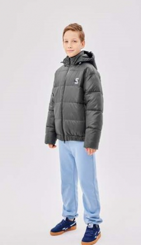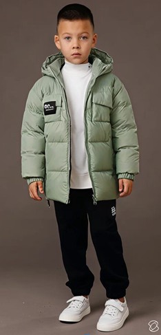 Куртка прямого силуэта, увеличенного объема со спущенной линией плеча. Застежка центральная на тесьму - молнию. Рукав втачной. Воротник цельнокроеный с капюшоном. Капюшон с внутренней регулируемой кулисой на шнур-резинку и фиксатор. В верхней части переда накладные карманы с клапаном , застегивающиеся на потайную ленту-велькро. В нижней части переда боковые карманы на листочку. Низ рукава с притачной манжетой на резинку и патами на ленту-велькро. Низ куртки фигурный. Вся куртка стегана широкими горизонтальными переборками.Утеплитель: Пух лебяжий синтетический.Температурный режим: От +5° до -10° С.Ткань: курточная ткань с фактурой "эко-кожа" Подклада: фольгированная (омни хит)