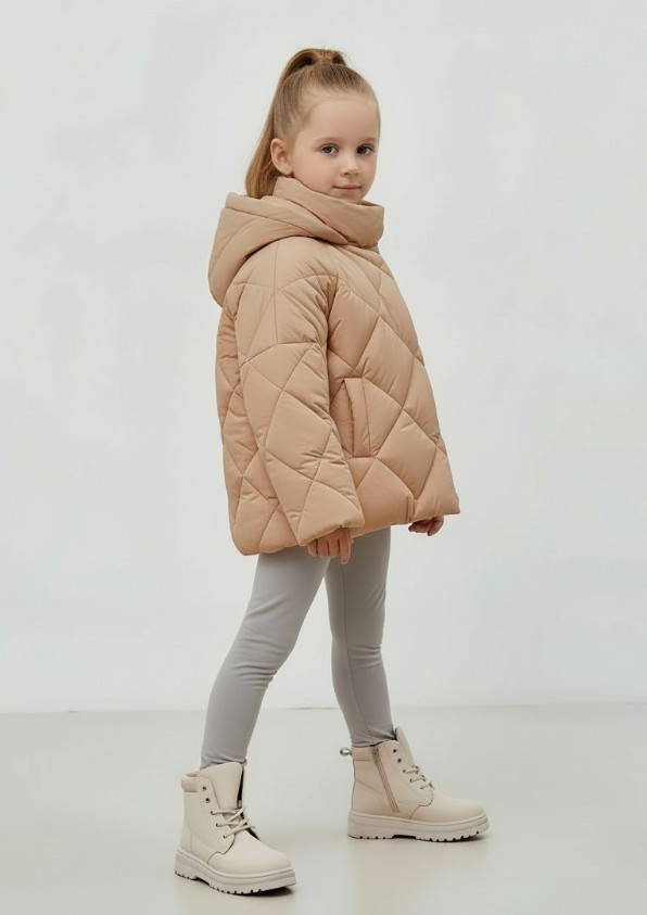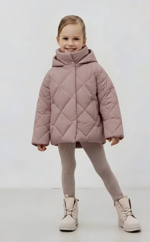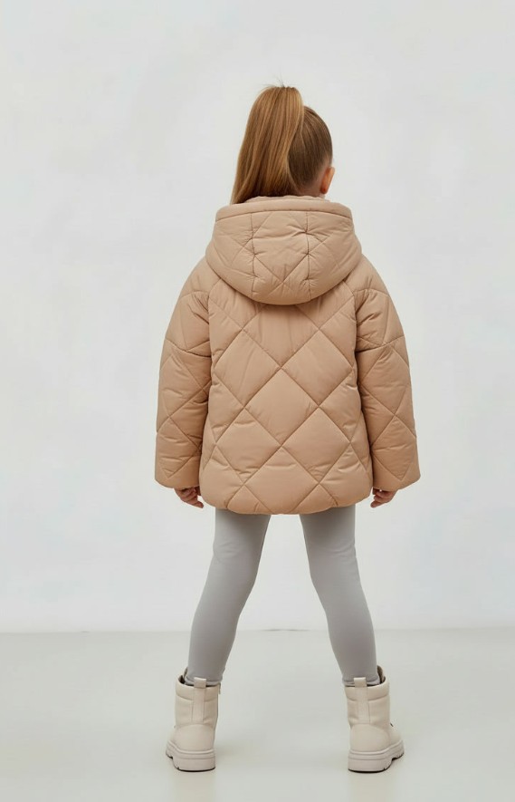 Куртка прямого силуэта. Рукав втачной, на основе цельнокроенного. Застежка центральная на тесьму - молнию, с цельнокроеной верхней ветрозащитной планкой, застегивающейся на потайные кнопки. Воротник отложной , с отрезной стойкой. На переде выполнены боковые вертикальные прорезные карманы с листочками. Изделие стеганое ромбами. Капюшон пристегивающийся на молнию. Край капюшона в центральной части собран на резинку