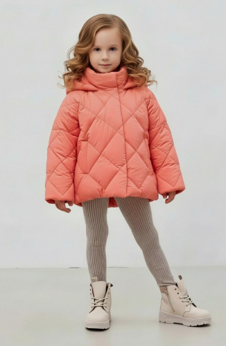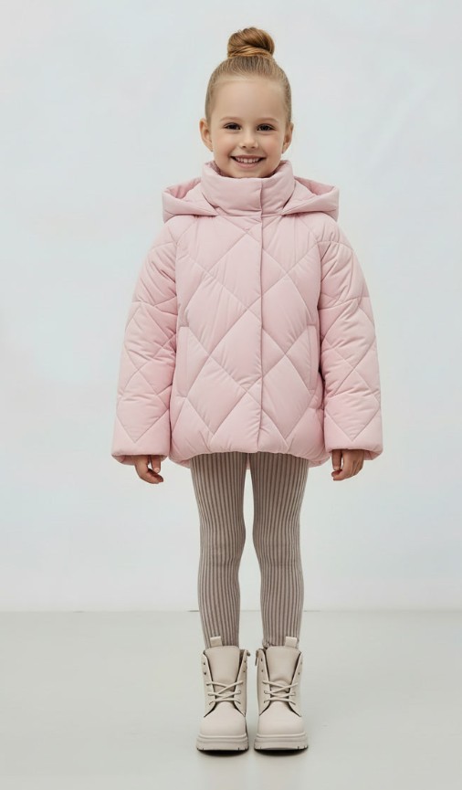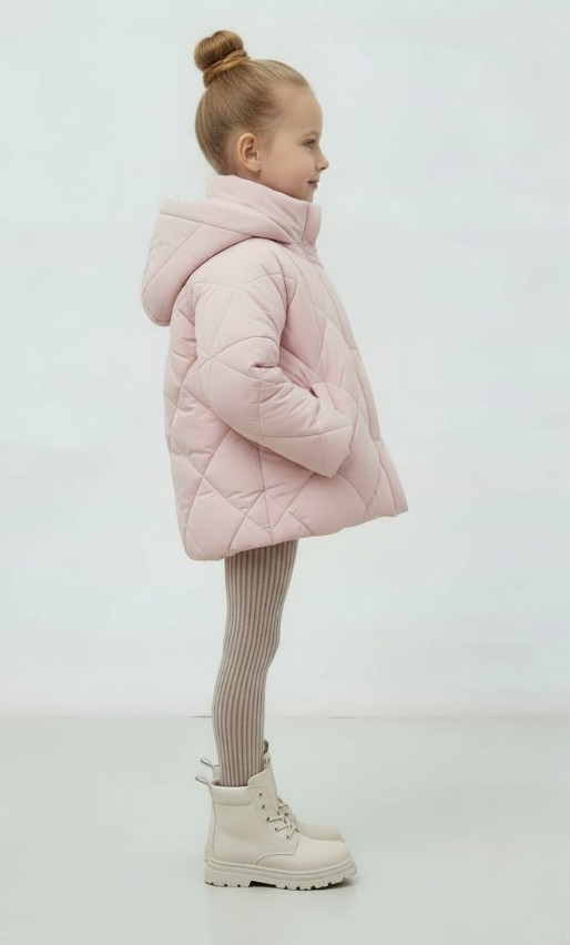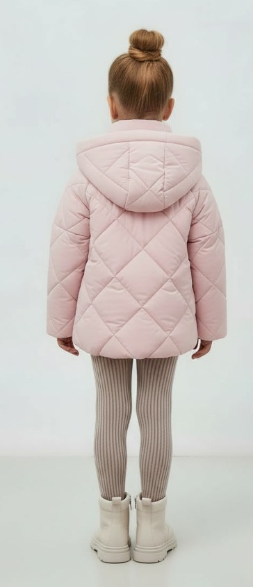 Куртка прямого силуэта. Рукав втачной, на основе цельнокроенного. Застежка центральная на тесьму - молнию, с цельнокроеной верхней ветрозащитной планкой, застегивающейся на потайные кнопки. Воротник отложной , с отрезной стойкой. На переде выполнены боковые вертикальные прорезные карманы с листочками. Изделие стеганое ромбами. Капюшон пристегивающийся на молнию. Край капюшона в центральной части собран на резинку