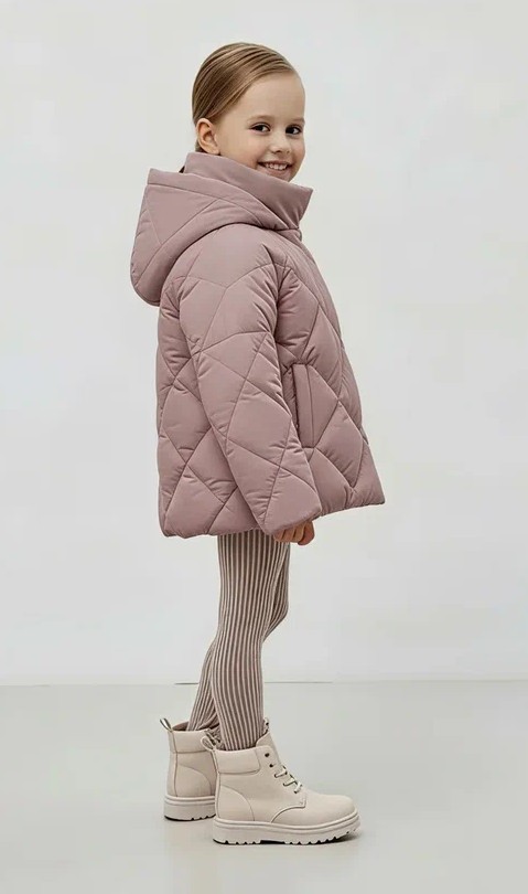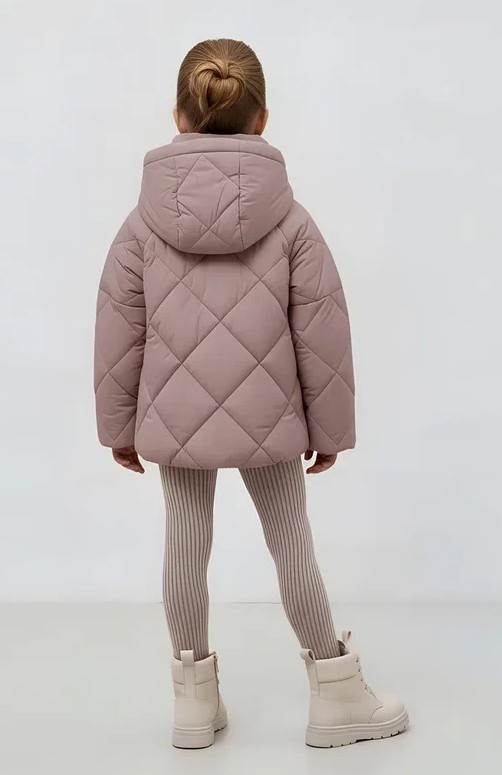 Куртка прямого силуэта. Рукав втачной, на основе цельнокроенного. Застежка центральная на тесьму - молнию, с цельнокроеной верхней ветрозащитной планкой, застегивающейся на потайные кнопки. Воротник отложной , с отрезной стойкой. На переде выполнены боковые вертикальные прорезные карманы с листочками. Изделие стеганое ромбами. Капюшон пристегивающийся на молнию. Край капюшона в центральной части собран на резинку