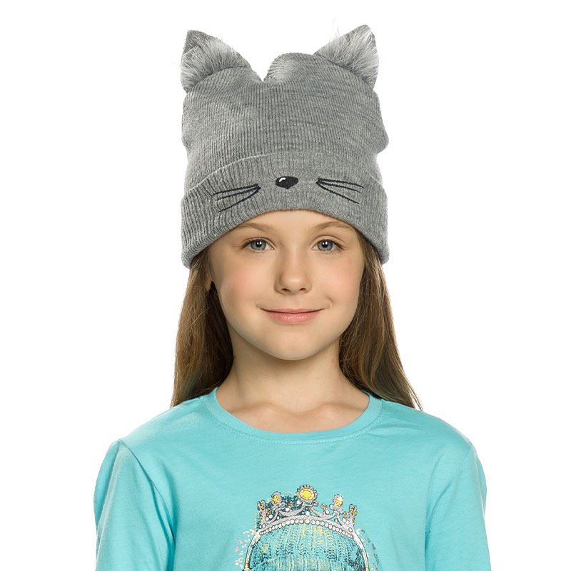 Состав: 100%акрил, подклад: 100%акрилОписание: Шапка для девочек. Шапка двойной вязки с отворотом: вид вязки риб 3*3. Вышивка в виде кошачьей мордочки: декоративные ушки с искусственным мехом.