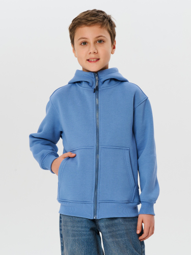 Толстовка детская из трикотажного полотна - футер с начесом, с втачным капюшоном, с центральной застежкой на молнию.  На полочке накладной карман-кенгуру. Манжеты и пояс из кашкорсе в цвет футера.