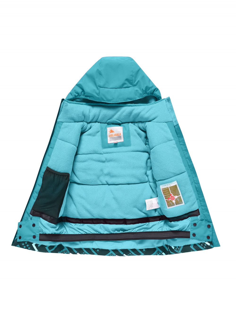 Детский зимний костюм включает в себя куртку прямого кроя с комбинированным дизайном и однотонные горнолыжные брюки.