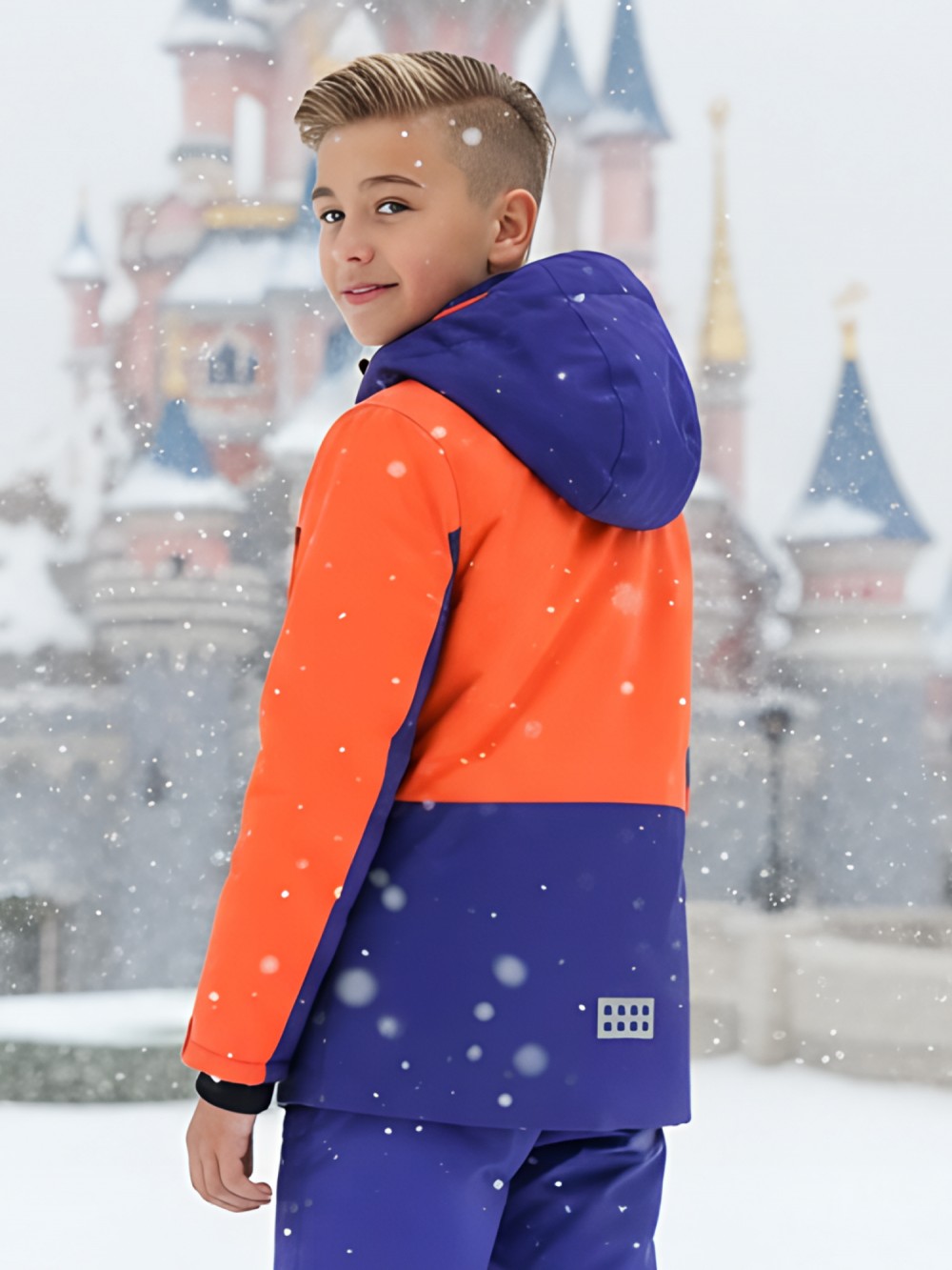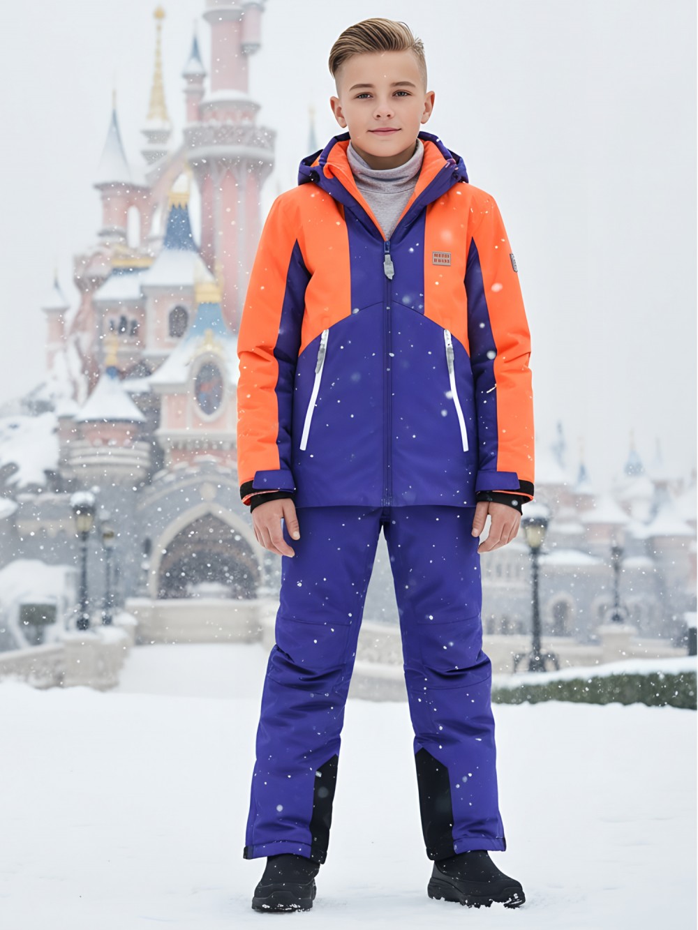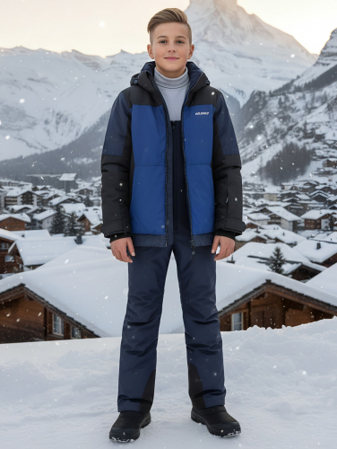 Подростковый зимний костюм включает в себя куртку прямого кроя с комбинированным дизайном и однотонные горнолыжные брюки.