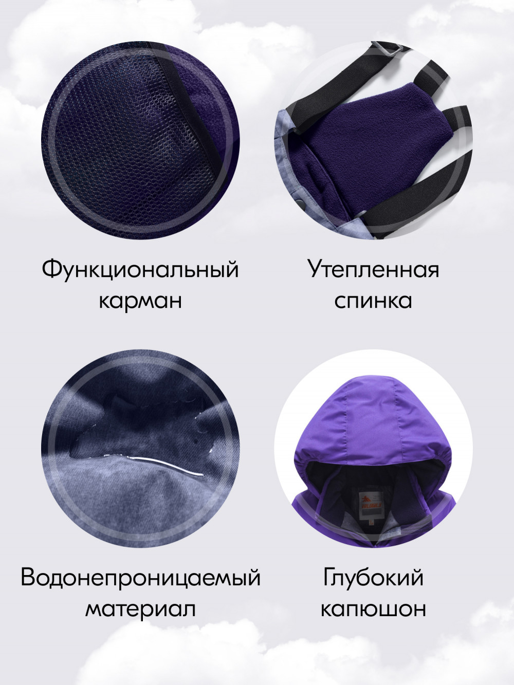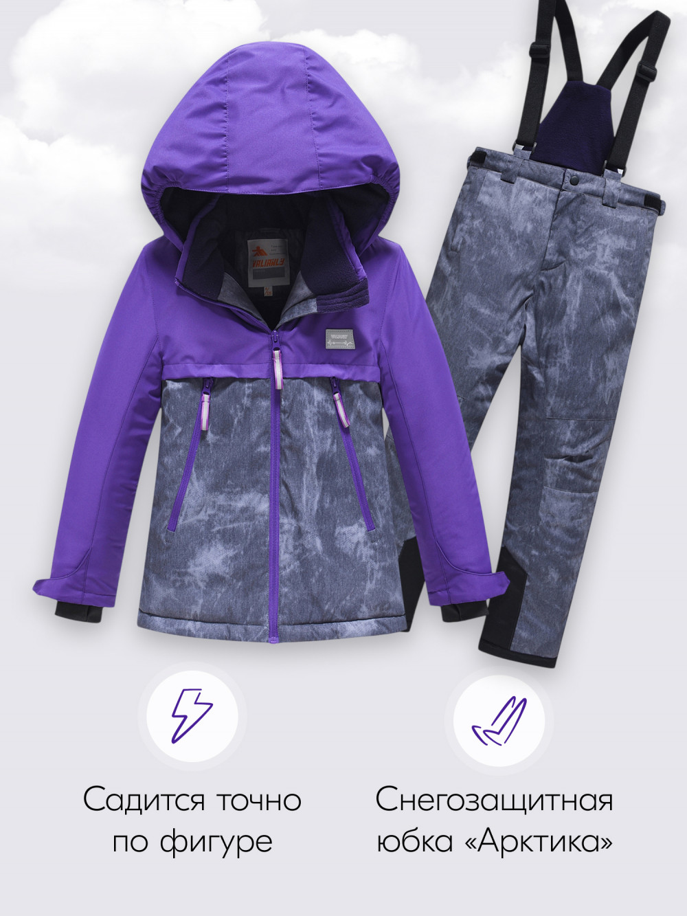 Снегозащитная юбка и снегозащитные гамаши не позволяют снегу попадать под куртку и в брюки, а комбинированный дизайн с эффектом варенки добавляет стильности и оригинальности.
