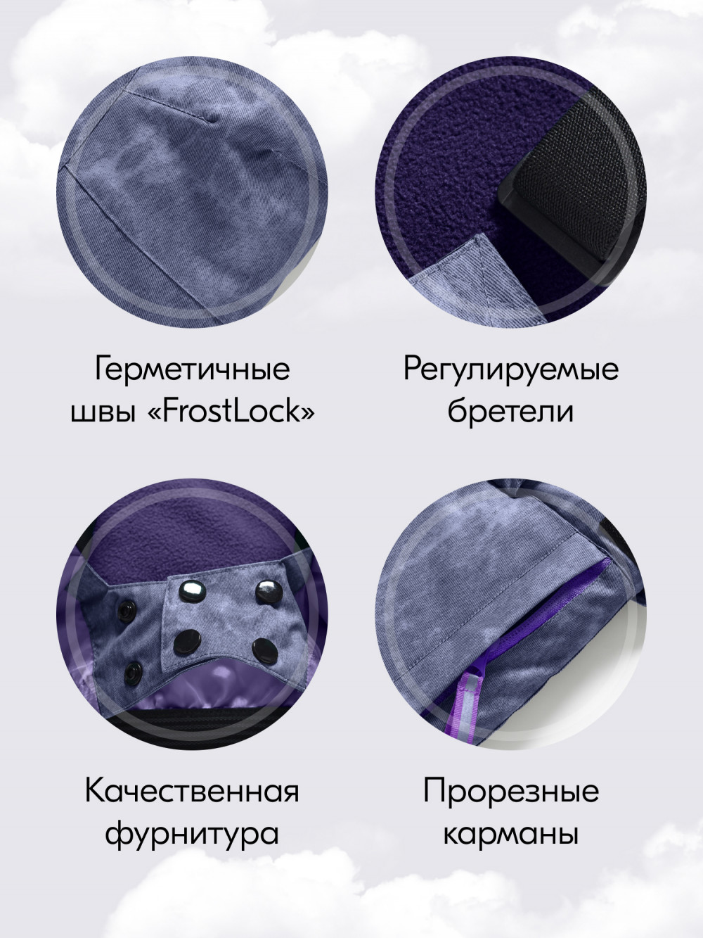 Поперечные швы на коленях обеспечивают свободу движений, а снегозащитные гамаши и расширитель для обуви эффективно защищают от попадания снега внутрь. Шлевки для ремня добавляют удобства в носке и позволяют легко регулировать посадку.