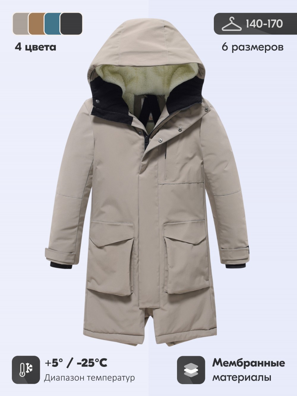 Эта парка представлена в стильных универсальных цветах — коричневом, тёмно-зелёном, чёрном и бежевом. Модель станет отличным выбором для родителей, которые ищут тёплую, удобную и долговечную зимнюю парку для мальчика-подростка, где сочетаются практичность, современный дизайн и комфорт.