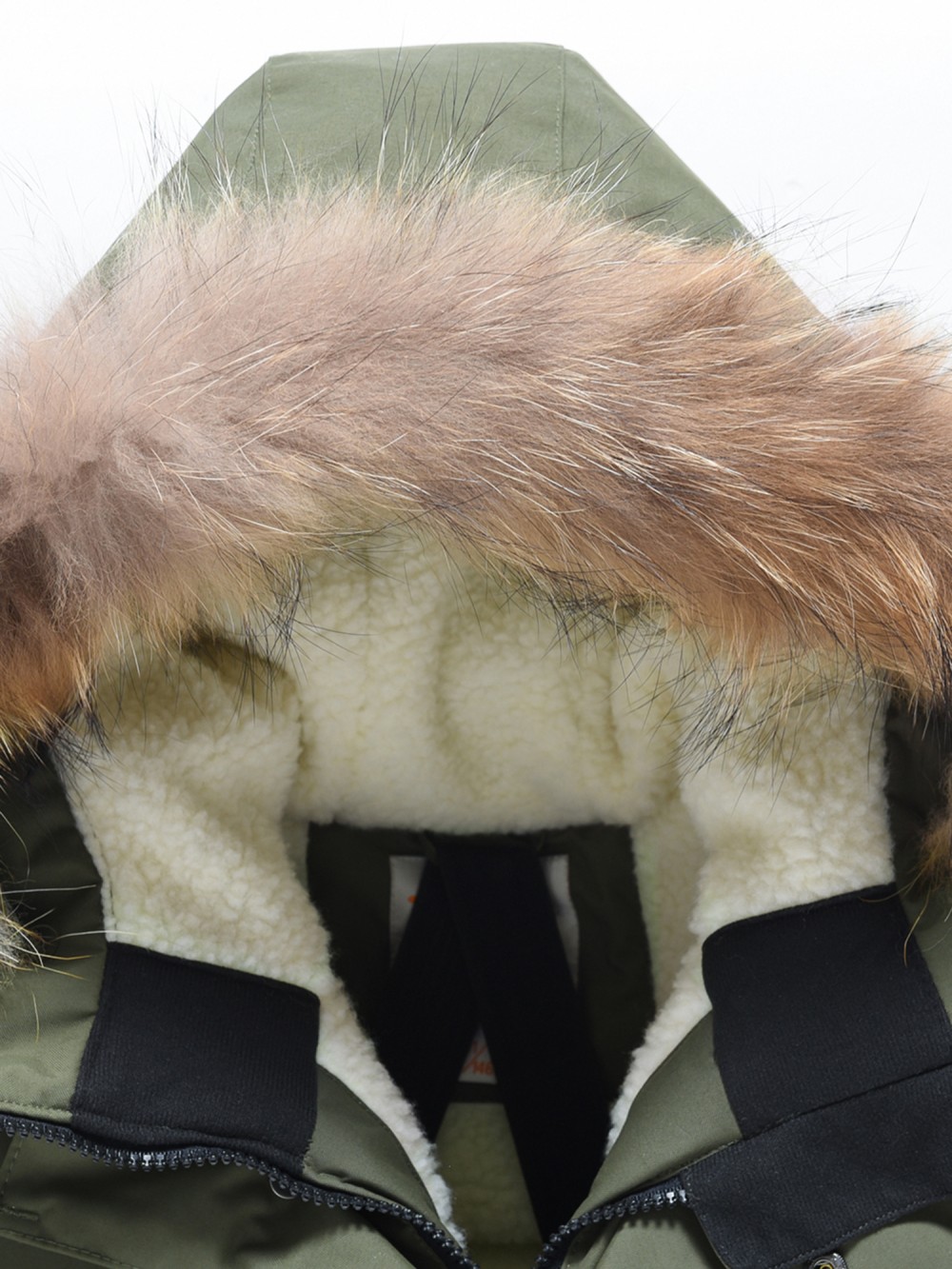 Внутренняя подкладка из овчины, полиэстера и флиса делает парку особенно уютной и приятной к телу. Тёплый капюшон с натуральным мехом енота надёжно защищает от снега и ветра, а опушка на молнии при желании легко снимается. Стояче-отложной воротник прикрывает шею и даёт дополнительную защиту в непогоду.