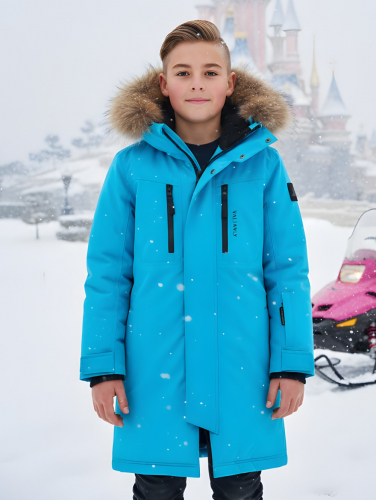 Парка зимняя подростковая для мальчика с капюшоном и мехом голубого цвета 9537Gl