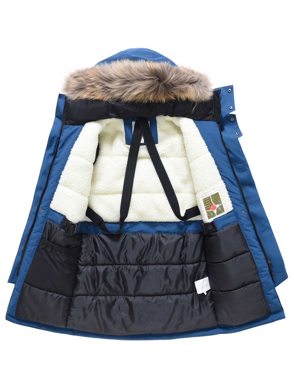 Внутренняя подкладка из овчины, полиэстера и флиса делает модель особенно уютной и приятной к телу. Капюшон несъёмный, он плотно прилегает к голове и дополнительно защищает от непогоды. Опушка из натурального меха енота на молнии при желании легко снимается. Стояче-отложной воротник надёжно закрывает шею и обеспечивает защиту даже без шарфа.