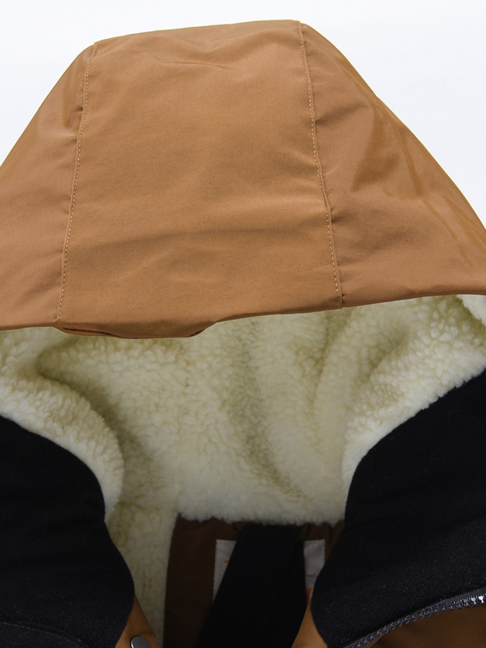 Внутренняя подкладка из овчины, полиэстера и флиса делает модель особенно уютной и приятной к телу. Капюшон несъёмный, он плотно прилегает и надёжно защищает голову в непогоду. Стояче-отложной воротник прикрывает шею и обеспечивает дополнительную защиту от ветра.