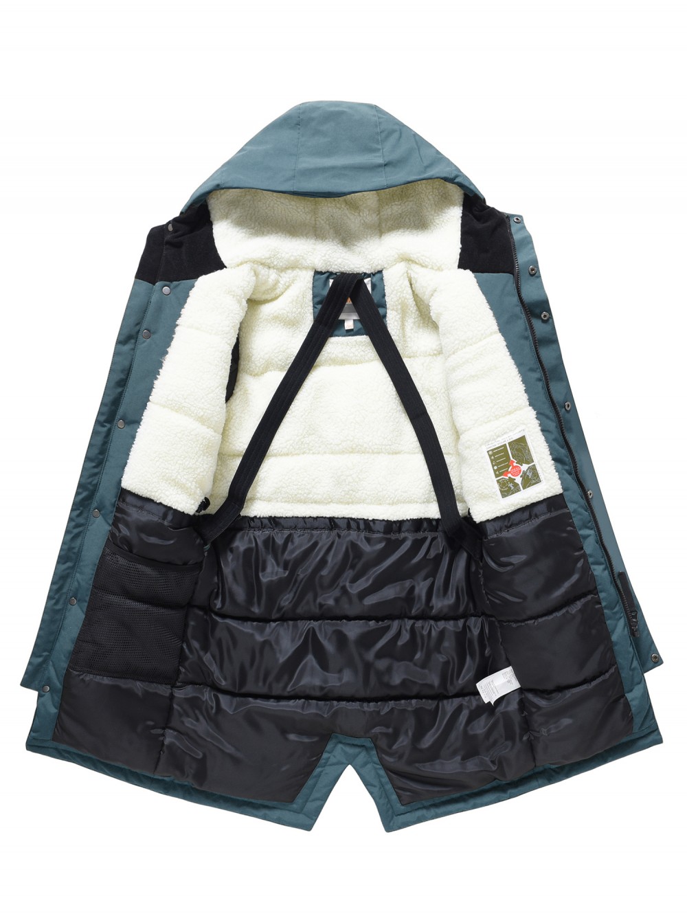 Внутренняя подкладка из овчины, полиэстера и флиса делает модель особенно уютной и приятной к телу. Капюшон несъёмный, он плотно прилегает и надёжно защищает голову в непогоду. Стояче-отложной воротник прикрывает шею и обеспечивает дополнительную защиту от ветра.