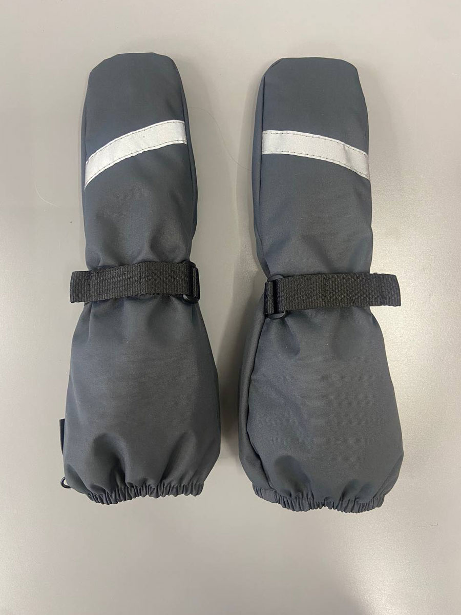 Варежки утепленные для детей из водонепроницаемой ткани. Подкладка из теплого флиса с утеплителем - синтепон. Утягиваются на запястье с помощью паты с липучкой. Место в области ладошки усилено более износостойкой тканью. Широкий манжет позволяет одевать варежку сверху рукава верхней одежды. Предусмотрено соединение рукавиц карабином друг к другу.