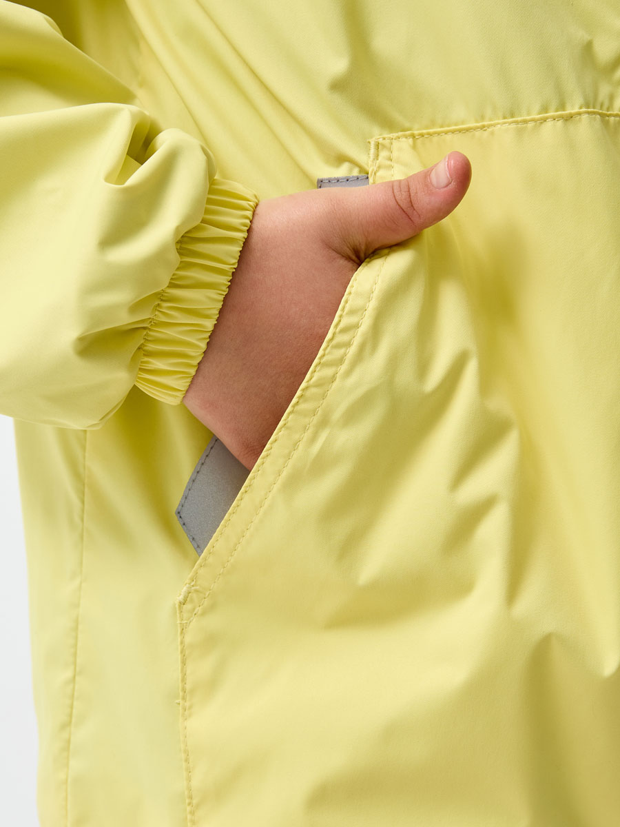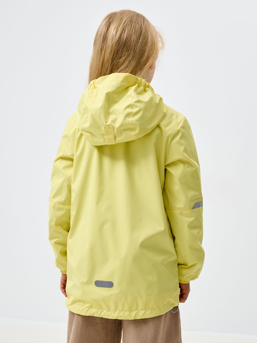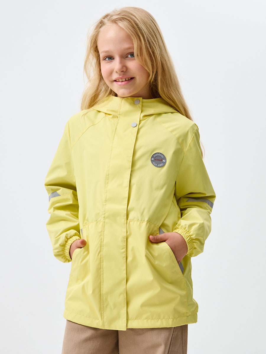 Ветровка для девочек, прямого силуэта, с втачным капюшоном. Центральная застёжка на молнию, закрытую центральной планкой на кнопках и липучке. По низу куртки кулиса с резиновым шнуром и фиксаторами для удобства прилегания. Подкладка из трикотажной сетки на полочке и спинке. На полочках 2 накладных кармана с кнопкой. На куртке расположены светоотражающие элементы. Рассчитана на температуру от +15 до +20. 100% полиэстер