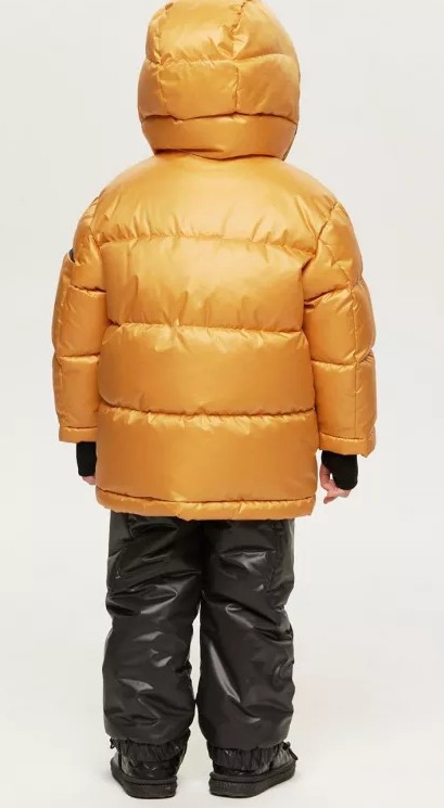 Костюм для мальчика состоит из куртки и полукомбинезона. Куртка прямого силуэта. Воротник цельнокроеный с капюшоном. По краю капюшона регулируемая кулиса. Застежка центральная. На левом рукаве карман на молнии. По низу рукава трикотажный манжет. Вся куртка стегана горизонтальными переборками. Полукомбинезон прямого силуэта. Бретели на резинке, регулируемые по длине. Верхняя часть полукомбинезона с застежкой на тесьму-молнию. Верхняя внутренняя часть полукомбинезона на флисе, нижняя часть на шелковой подкладке. Пояс на спинке с резинкой для удобства прилегания. Низ полукомбинезона с притачными манжетами на широкой резинке.