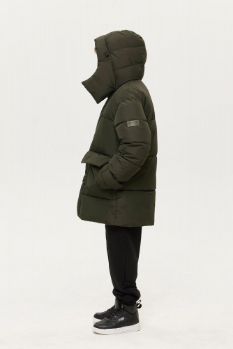 Пуховик имеет слегка спущенную линию плеча, что обеспечивает комфортную посадку. Воротник увеличенного объема с капюшоном застегивается на внутренние кнопки и регулируется по объему. Центральная застежка на молнию утеплена верхней ветрозащитной планкой на кнопках, что препятствует попаданию ветра и холодного воздуха.