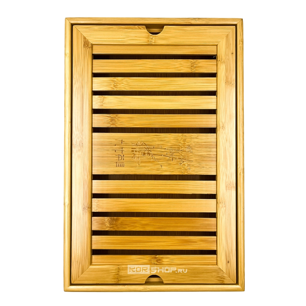 Чайная доска из бамбука 23х36 см – рабочая платформа чайного мастера. Ее также называют «чабань» (от кит. 茶板, chábǎn – «чайная доска»). Она представляет собой поднос с прорезями и поддоном для сбора пролитой во время заваривания и разливания чая воды. На ней располагают посуду для чаепития. Прорези и поддон позволят не беспокоиться о проливе воды и не отвлекаться во время чайной церемонии, осуществлять слив остатков чая из пиал и омовение пиал, не покидая свое место.