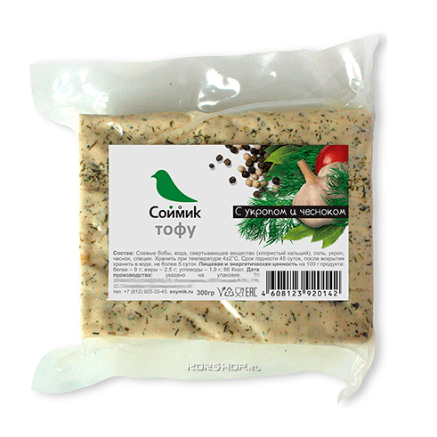 Состав: Соевые бобы, вода, свертывающее вещество (хлористый кальций), соль, укроп, чеснок, специи.