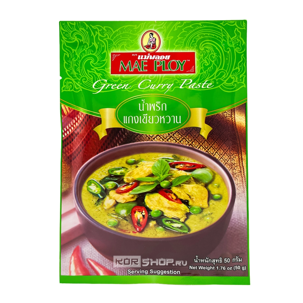 Зеленая паста карри Mae Ploy – это основа для приготовления зеленого карри, который является самой острой разновидностью тайских блюд карри на кокосовом молоке. Густой суп-рагу обладает высочайшей степенью остроты. Зеленая паста карри на треть состоит из острейших зеленых перцев чили и представляет собой пастообразную смесь традиционных тайских приправ – перетертых в пюре стручков перца, стеблей лемонграсса, чеснока, корня галангала, листьев кафрского лайма с добавлением креветочной пасты, соли, семян кориандра, зиры и куркумы. Эта комбинация вкусов в сочетании с кокосовым молоком и задает вкус зеленому карри. С готовой пастой приготовить знаменитое острейшее тайское блюдо можно всего за 10-15 минут, обжарив пасту на кокосовом молоке и добавив воду, кусочки мяса и овощей. Тайский зеленый карри имеет густую сливочную консистенцию.