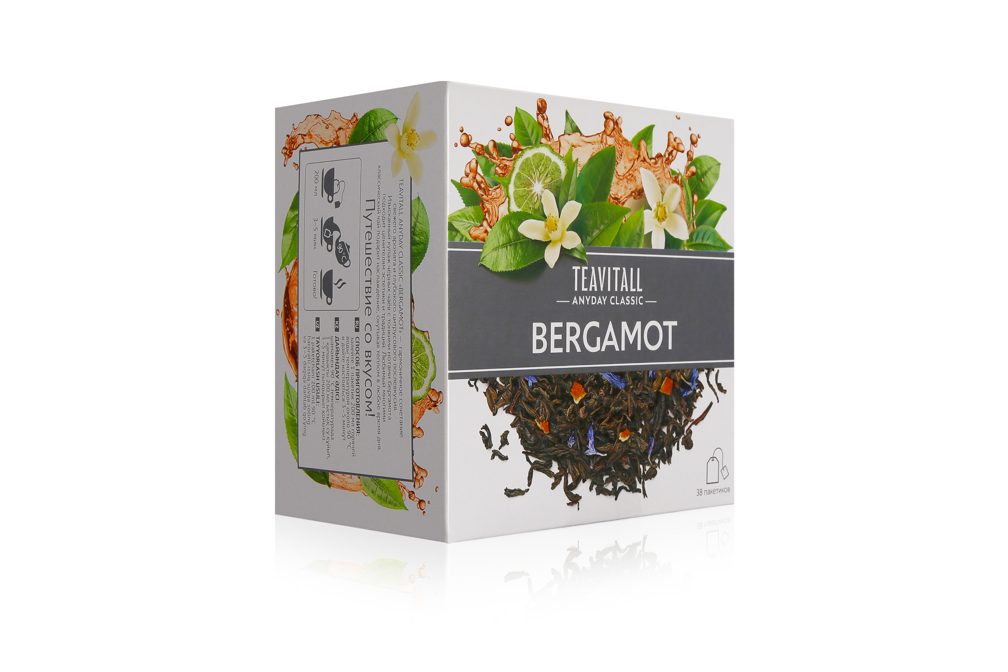 TEAVITALL ANYDAY CLASSIC «BERGAMOT» — гармоничное сочетание благородства сортов черного чая с чарующим ароматом бергамота. Изысканный купаж черных чаев по достоинству признан ценителями эстетики и традиций. Благодаря нотам бергамота, чайный напиток наполняется свежим, чуть терпким ароматом, оставляя ощущение глубокого цитрусового послевкусия. Любимый многими классический чай окутывает теплом в любое время дня. Каждая чайная церемония превращается в настоящий ритуал, который дарит наслаждение и ощущение неповторимого магического момента. Смесь цейлонского и индийского чая в сочетании с бергамотом распространена по всему миру и уже успела приобрести свой узнаваемый и уникальный вкус. Тонкий освежающий аромат с легкой цитрусовой сладостью придает черному чаю особенное богатство вкусовых оттенков. Однако, главный секрет пользы черного чая с бергамотом кроется в его влиянии на общее состояние всего организма. Он улучшает обменные процессы, ускоряя обмен веществ. Ярко выраженный аромат бергамота дарит ощущение бодрости, повышает концентрацию внимания и наполняет организм энергией для новых свершений. Регистрационный № РОСС RU.32432.04БПЭ0.ОС12.28716 Состав: Цейлонский черный чай, индийский черный чай, натуральный ароматизатор «бергамот». Способ приготовления: Залейте 1 пакетик 200 мл горячей воды температурой около 90 °С и дайте настояться 3-5 минут. Противопоказания: не использовать при индивидуальной непереносимости компонентов. Срок годности: 18 месяцев с даты изготовления. Рекомендации по хранению и использованию: Хранить в сухом, защищенном от света месте без посторонних запахов с относительной влажностью не более 70%. Масса нетто: 76 г (38 фильтр-пакетов по 2 г)