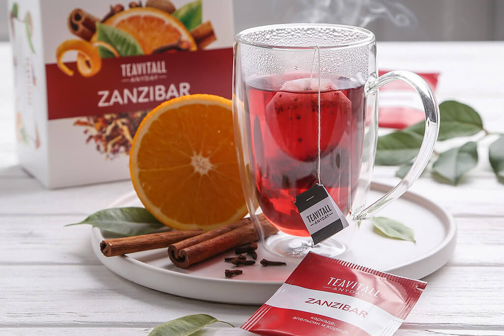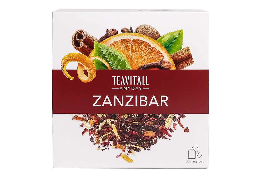 Чайный напиток TeaVitall Anyday «Занзибар» — это ваше путешествие на незабываемый остров с удивительной природой, белоснежными пляжами и бирюзовой водой Индийского океана. Соприкасаясь с горячей водой в вашей чашке, каркаде, словно акварель, окрашивает ее в насыщенный красный цвет, жаркий, как закат на берегу тропического рая. Чайный напиток обогащен цитрусовыми нотами с приятной апельсиновой кислинкой и ароматом пряностей. При остывании напиток становится приятно освежающим. Занзибар — это остров специй. На рынке пряностей смешиваются самые разные специи, погружая вас в удивительные сказки «Тысячи и одной ночи». Окунитесь в особую атмосферу, таящуюся в тропическом райском уголке! Возвращайтесь в пряное лето вместе с TeaVitall Anyday «Занзибар»! Способ приготовления Залейте 1 чайный фильтр-пакет горячей водой температурой около 90 °C и дайте настояться 7–10 минут. Срок годности 18 месяцев с даты изготовления. Условия хранения Хранить в сухом, защищенном от света месте без посторонних запахов с относительной влажностью не более 70 %. Масса нетто: 68,4 г (38 фильтр-пакетов × 1,8 г). Каркаде (цветки), корица (кора), корка плодов апельсина, солодка (корень), гвоздика (бутон), семена мускатного дерева. Сердце чайного купажа TeaVitall Anyday «Занзибар» — к аркаде, который мгновенно напитывает вас ощущением легкости и романтики. Благодаря его кислинке даже при остывании напиток сохраняет особый пикантный вкус. Искра корицы , слегка жгучая и терпкая, согревающая и одновременно нежная, охладит для вас жаркий день. Апельсиновая цедра завершает авторский купаж ярким тропическим аккордом. Витамин С, которым она богата, поможет дополнительно противостоять вирусным заболеваниям. Солодка делает чай умеренно сладким, а бутоны гвоздики дарят вкусу взрывную дерзость. Семена мускатного ореха добавляют пряности, остроты и экзотики.