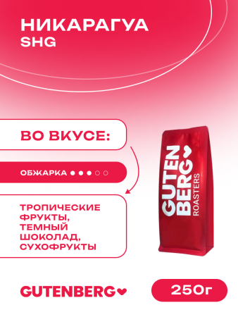 Сорт арабики, выращенный на вулканических склонах Никарагуа, относится к высококлассным сортам, попадающим под классификацию — SHG расшифровывается как Strictly High Grown, что означает «исключительно высокогорный» и особо ценятся кофейными гурманами. На вкус кофе из Никарагуа влияют особенности местного климата и характеристики почвы. В чашке этот сорт достаточно насыщенный с ароматом цветочных и хлебных нот, во вкусе - экзотические фрукты, с ореховыми и шоколадными оттенками.