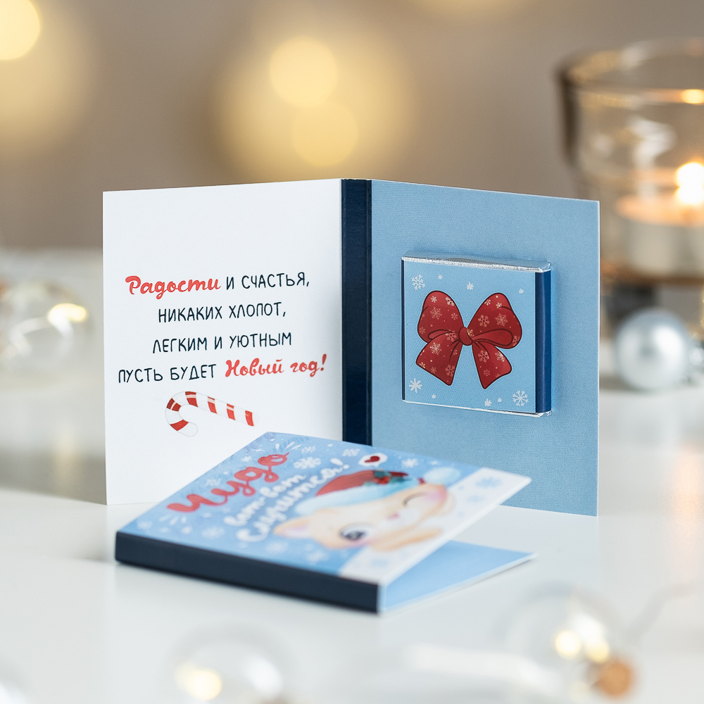 Внутри открытки - 1 шоколадка (вес 5 г., размер: 31 х 31 мм.)
