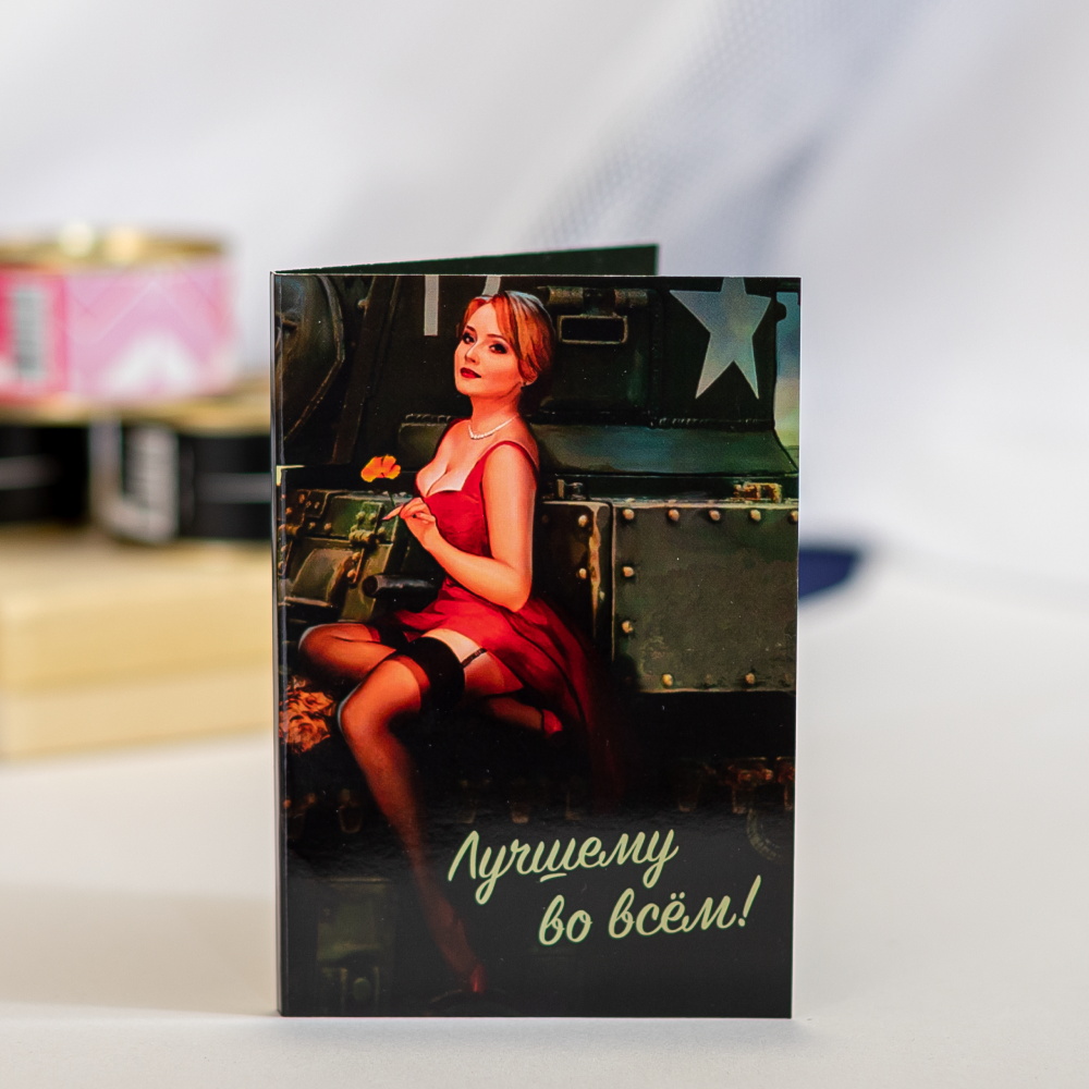 Открытка 4 шоколадки "Лучшему во всём" (девушка на танке)