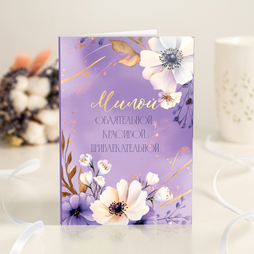 Открытка 4 шоколадки "Милой, обаятельной, красивой, привлекательной (сиреневая)"