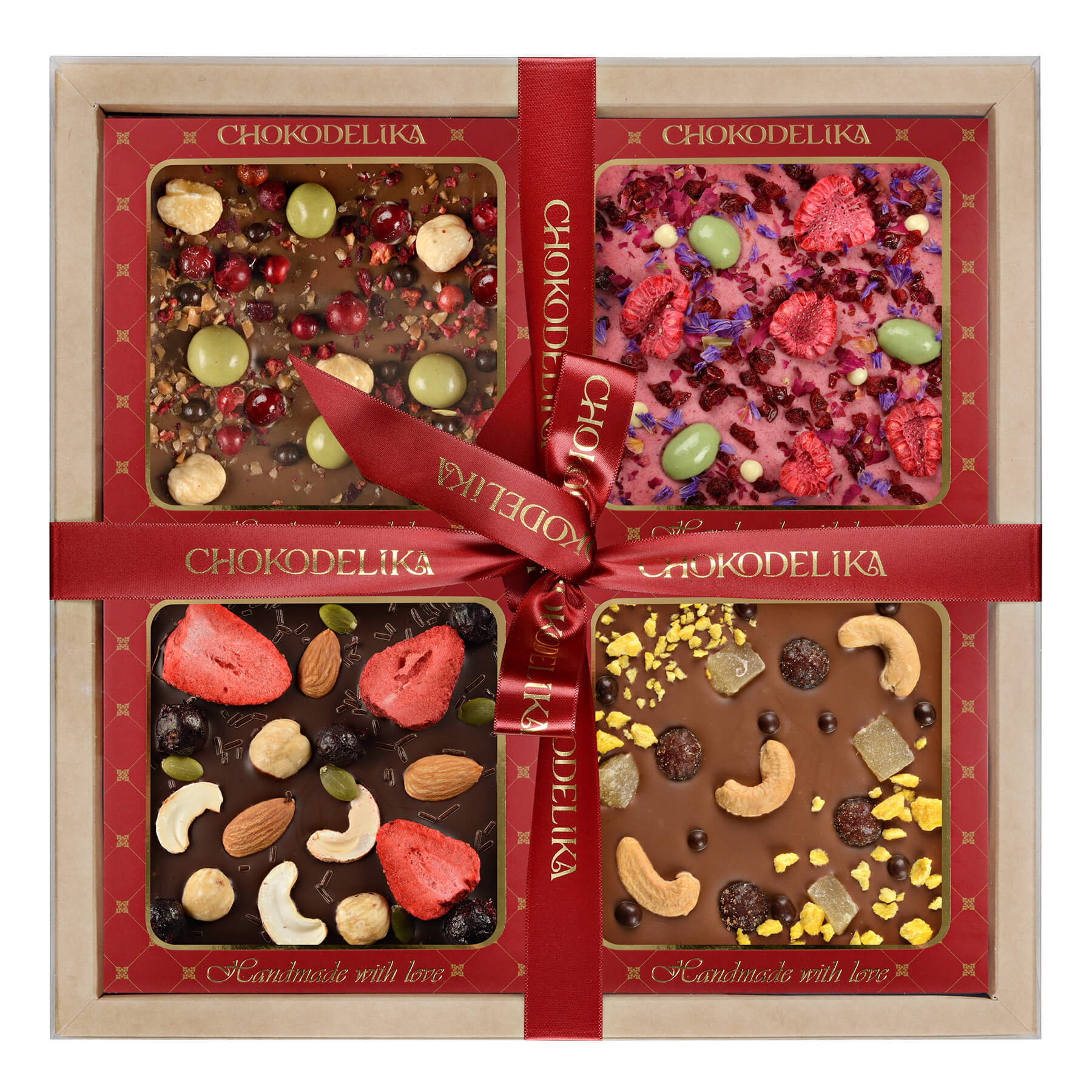 Состав: молочный шоколад (сахар, масло какао, цельное сухое молоко, какао тертое, эмульгатор: соевый лецитин, натуральный ароматизатор ванильный), фундук обжаренный, вишня сушеная, карамель леденцовая, воздушный рис в темном шоколаде, брусника сушеная.