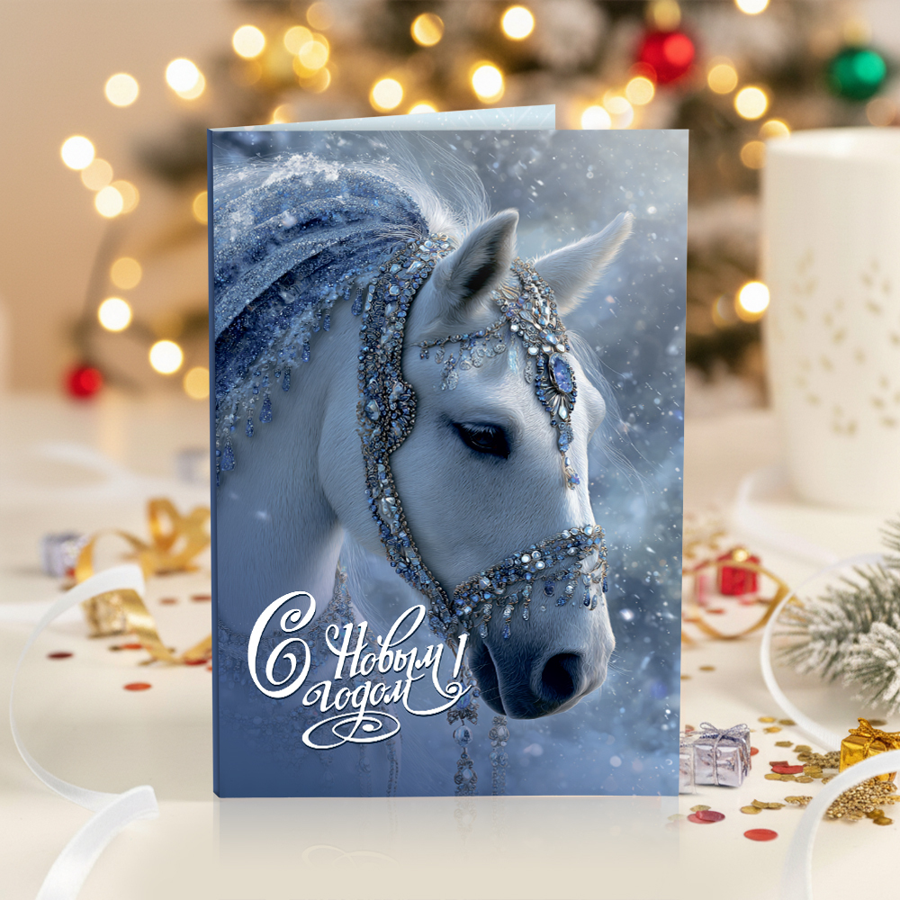 ★︎ Открытка 4 шоколадки "С Новым годом! (лощадь с синими украшениями)"
