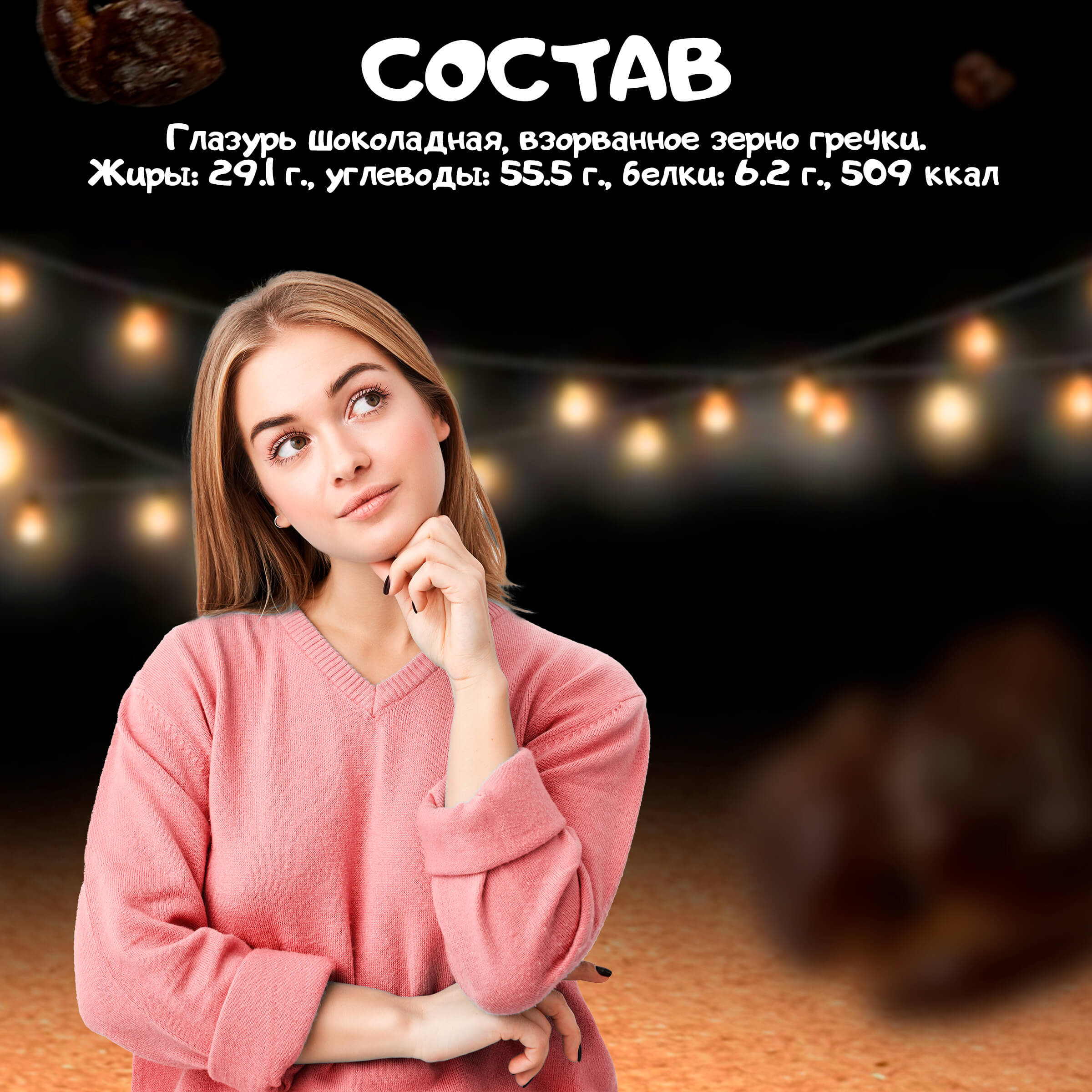 Глазурь шоколадная (сахар, какао-масло, какао-продукты, эквивалент какао масла, эмульгаторы лецитин, полиглицерин, ароматизатор «ванилин»), взорванное зерно гречки.