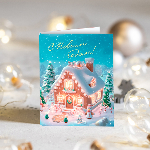 Мини-открытка "Уютного Нового года (бирюзовая с домиком)"