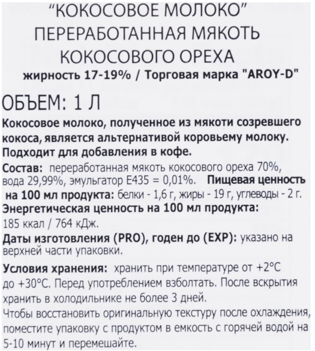 Кокосовое молоко Aroy-D 60%, без сахара – это только кокосовый орех и вода, необходимая для доведения мякоти кокоса до жидкой консистенции, ничего лишнего.