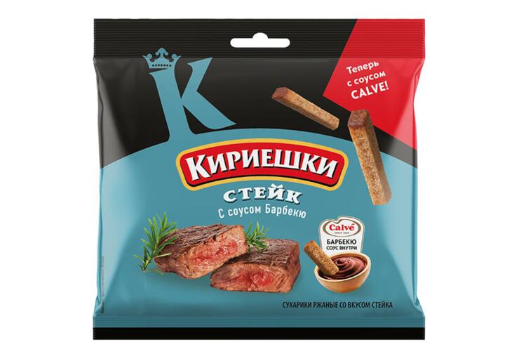 В пачке 60 г сухариков и упаковка соуса барбекю «Calve» 25 мл.