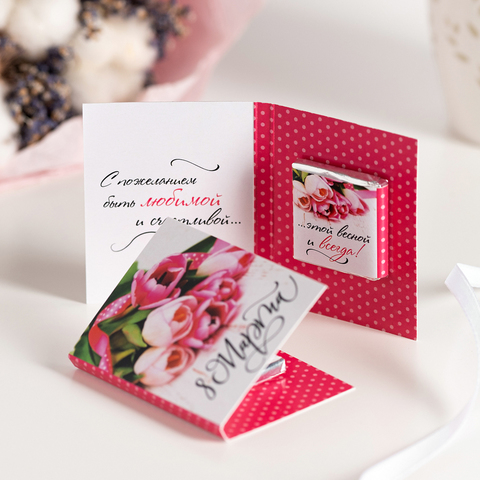 Внутри открытки - 1 шоколадка (вес 5 г., размер: 31 х 31 мм.)