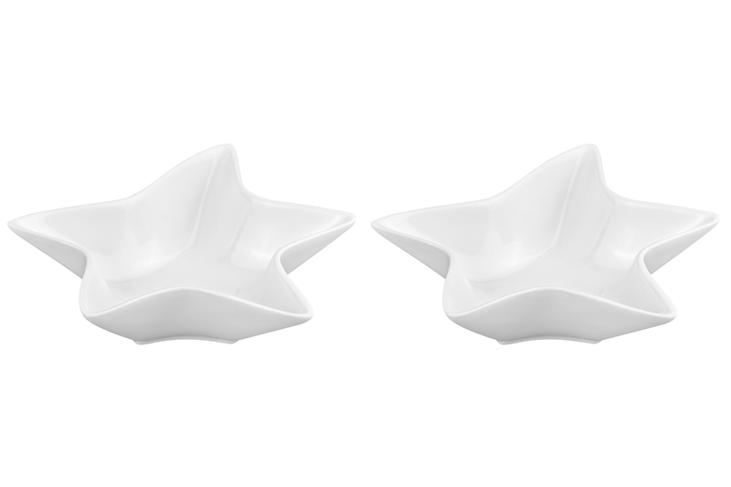 Набор из двух сервировочных блюд "Звезда" размером 14х14х3,5 см и объемом 150 мл выполнен из белого фарфора. Декоративная посуда необычной формы станет гармоничным дополнением при сервировке вашего стола как в будни, так и на праздник. Используйте сервировочное блюдо в форме звёздочки для любых закусок: салатов, маринованных овощей, икры или орехов. Идеально подойдёт для маслин или оливок! Благодаря функциональности тарелки вы сможете предложить гостям множество разнообразных вариантов, например, суши и роллы. Формочки отлично подойдут для угощения гостей печеньем и конфетами. Не рекомендуется применять абразивные моющие средства. Можно использовать в микроволновой печи. Поставляется в картонной упаковке. Подойдёт в подарок любой хозяйке. Функциональность тарелочки оценит каждый, а высокое качество фарфора обеспечит долговечность этого подарка. Пусть набор из двух блюд для сервировки поможет создать комфорт и уют на вашей кухне!