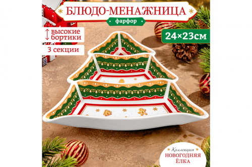 БЫЛО 1240 руб! Блюдо-менажница 24*23,5*3,5 см "Новогодняя елка" зеленый узор, цельная 3 секции NEW BONE CHINA