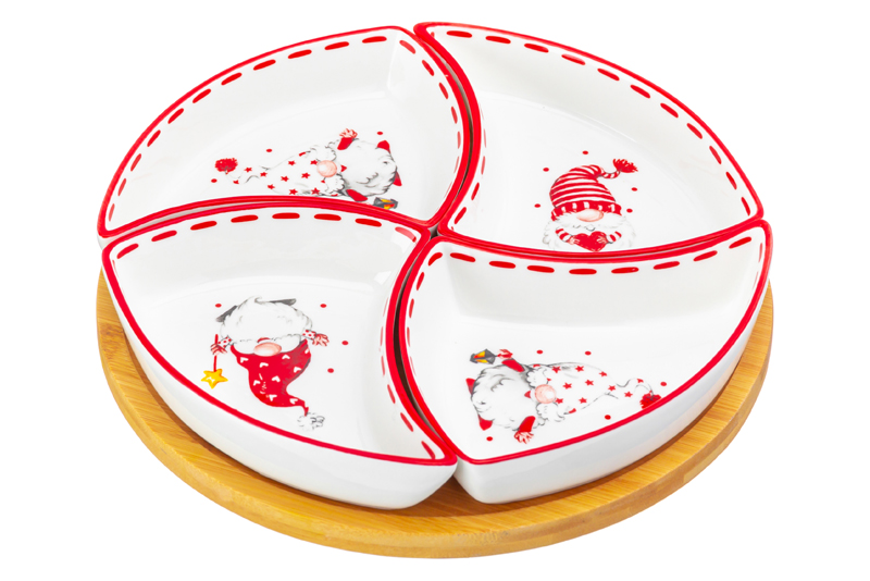 БЫЛО 1679 руб! Менажница 25*25*6 см "Весёлые гномики" крутящ. 4 секции на дерев. подставке