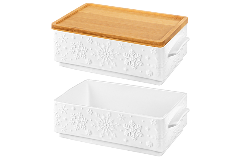 Набор серии "Снежинки" состоит из 2-х прямоугольных блюд по 800 мл с деревянной крышкой - подставкой. Блюда можно хранить друг на друге. Верхнее блюдо будет крышкой для нижнего. Большие глубокие тарелки подойдут для подачи к столу сыра, нарезки, закусок, салатов, плова, овощей, фруктов. Подойдут для использования в роли шубниц, помогут в приготовлении холодца, желе, мороженого. Выполнены из высококачественного фарфора и украшены декоративными рельефными узорами. Фарфоровая посуда отличается от керамической повышенной плотностью. Фарфор не впитывает цвет продуктов и не деформируется от влаги, чему может быть подвержена керамика. Размер каждого блюда 20х12,5х11,5 см. Сервировочные блюда без крышки можно использовать в СВЧ, ПММ, духовом шкафу. Температурный режим до 230 градусов, беречь от резких перепадов температур. Набор поставляется в яркой картонной упаковке. Сервировочные блюда серии "Снежинки" смогут стать настоящим украшением кухни или приятным подарком для ваших родных и близких!