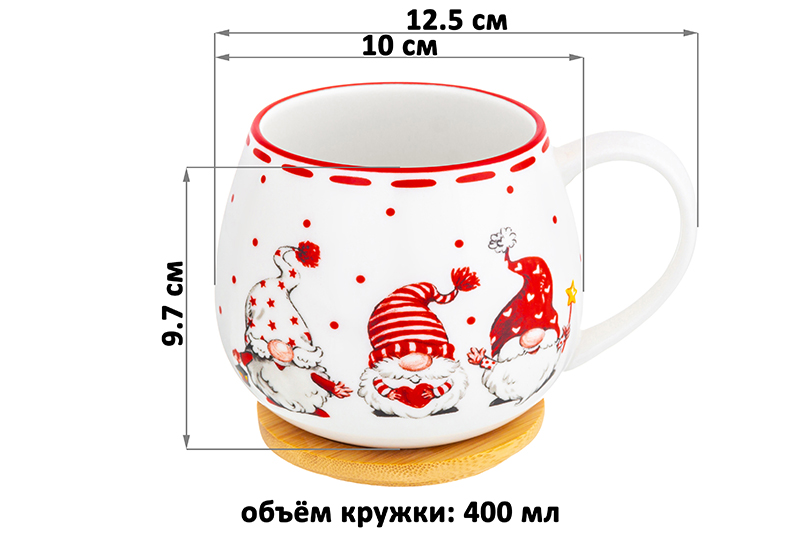 Кружка из серии «Весёлые гномики» от Elan Gallery предназначена для эстетичной сервировки вашего стола. Размер изделия – 12,5х10х9,7 см, объём – 400 мл. Выполнена из высококачественного белого фарфора. Он не впитывает цвет напитков и легко отмывается, благодаря чему надолго сохраняет свою белизну. Поверхность изделия украшает яркий рисунок в виде забавных гномиков. Крышка-подставка выполнена из натурального бамбука. Кофейная кружка поможет вам провести множество приятных завтраков с капучино и латте, а также уютные чайные вечера с конфетами, вафлями, другими десертами и сладостями. Подойдёт ценителям чая и кофе, которые любят пить из красивой и необычной посуды. Согрейтесь зимой любимым напитком: какао с маршмэллоу, ягодным чаем, горячим шоколадом или глинтвейном. Летом освежитесь домашним лимонадом или морсом. Бамбуковый элемент может служить как подставкой для защиты поверхностей от воздействия высоких температур, так и крышкой, защищающей напитки от пыли и грязи. Декоративное изделие позволит организовать запоминающееся чаепитие. Фарфоровая посуда с изображением маленьких новогодних помощников привнесёт в любое помещение дух волшебства и праздника! Это оригинальный элемент вашего декора. Не рекомендуется применять абразивные моющие средства. Без бамбукового элемента подходит для использования в посудомоечной машине и микроволновой печи. Бамбук нельзя замачивать! Поставляется в дизайнерской картонной коробке – благодаря ей вам не потребуется дополнительная подарочная упаковка. Изделие станет прекрасным сувениром на память и отличным подарком для друзей и близких. Серия «Весёлые гномики» от бренда Элан Галерея поможет вам погрузиться в атмосферу Нового года и Рождества и наполнит ваш дом зимним уютом!