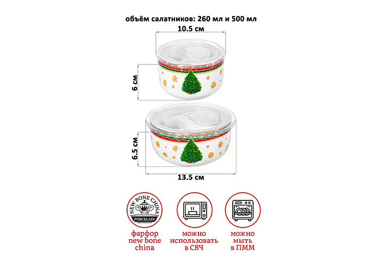 Набор 2 салатников из серии «Новогодняя ёлка» от Elan Gallery предназначен для эстетичной сервировки вашего стола. Включает изделия разных размеров: 13,5х13,5х6,5 см (объём 500 мл) и 10,5х10,5х6 см (объём 260 мл). Выполнены из фарфора нового поколения new bone china, сочетающего в себе изящность и высокую прочность. Такие изделия легко отмываются, поэтому сохраняют привлекательный вид и практичны в использовании. Плотная структура материала позволяет посуде дольше сохранять температуру блюд и напитков. От других видов костяного фарфора new bone china отличается большей экологичностью в производстве. Поверхность украшена широкой цветной окантовкой, изображением пушистой наряженной ёлочки, узором из снежинок и имбирных пряников. Большие глубокие миски станут идеальным вариантом для любителей здорового питания. Используйте их для приготовления и подачи салатов, а также для сервирования овощей и фруктов. Кроме того, они подойдут для холодных закусок и гарниров, разнообразных сладостей и десертов. Задействуйте в качестве конфетниц для организации уютного чаепития. Герметичные пластиковые крышки с силиконовыми уплотнителями надёжно защитят продукты от попадания грязи и пыли и позволят хранить готовые блюда в холодильнике. Не рекомендуется применять абразивные моющие средства. Подходят для использования в посудомоечной машине. Без крышки или с открытым клапаном подходят для использования в микроволновой печи. Поставляются в дизайнерской картонной коробке – благодаря ей вам не потребуется дополнительная подарочная упаковка. Фарфоровая коллекция посуды «Новогодняя ёлка» от бренда Элан Галерея создаст в доме атмосферу волшебства и подарит праздничное настроение. В серии вы найдёте всё необходимое, чтобы встретить праздник в тёплом семейном кругу. Эта коллекция посуды станет приятным подарком вашим близким на Новый год и будет долго напоминать о вашей дружбе!
