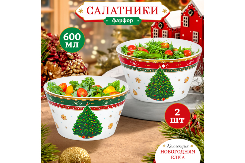 БЫЛО 766 руб! Набор 2 салатников 600 мл 13*13*7,5 см "Новогодняя елка" зеленый + красный узор NEW BONE CHINA