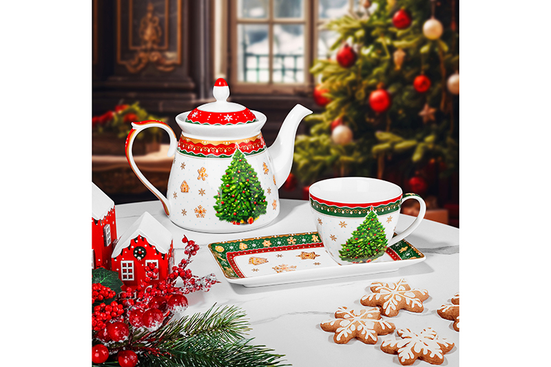 Чашка 250 мл с блюдцем для десерта 20*10*2 см "Новогодняя елка" красный узор NEW BONE CHINA